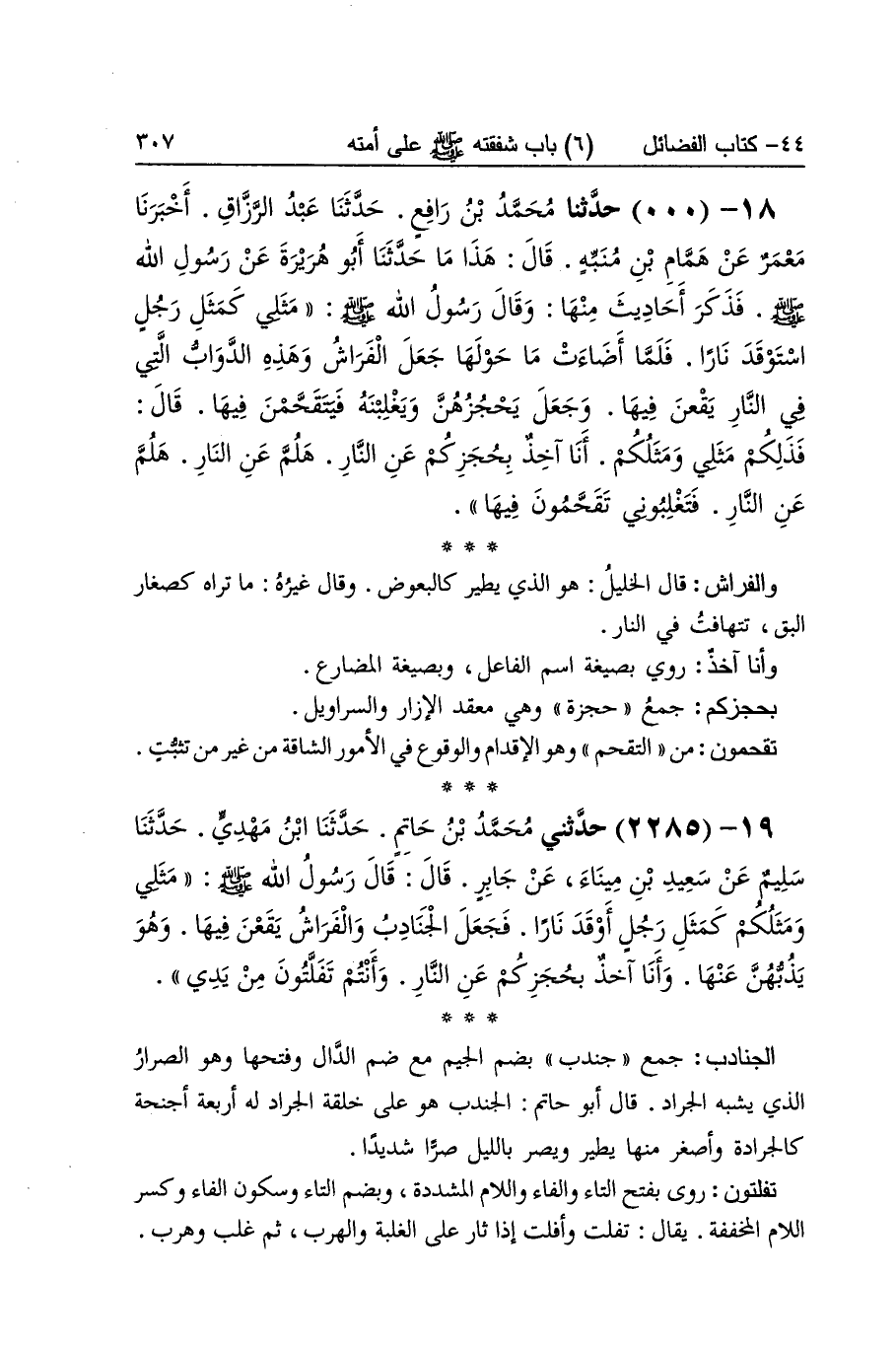 [2284] والفراش قَالَ الْخَلِيل هُوَ الَّذِي يطير كالبعوض وَقَالَ غَيره مَا ترَاهُ كصغار البق تتهافت فِي النَّار وَأَنا آخذ رُوِيَ بِصِيغَة اسْم الْفَاعِل وبصيغة الْمُضَارع بِحُجزِكُمْ جمع حجزة وَهِي معقد الْإِزَار والسراويل تقحمون من التقحم وَهُوَ الْإِقْدَام والوقوع فِي الْأُمُور الشاقة من غير من تثبت