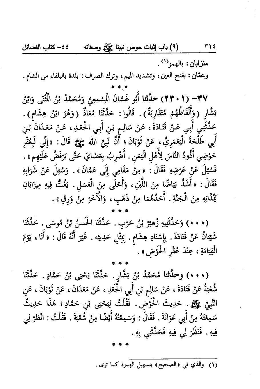 [2300] أَلا فِي اللَّيْلَة الْمظْلمَة المصحية بتَخْفِيف أَلا وَهِي للاستفتاح وَخص اللَّيْلَة الْمظْلمَة المصحية لِأَن النُّجُوم ترى فِيهَا أَكثر وَالْمرَاد بالمظلمة الَّتِي لَا قمر فيهامع أَن النُّجُوم طالعة فَإِن وجود الْقَمَر يستر كثيرا من النُّجُوم آنِية الْجنَّة رُوِيَ بِالنّصب بإضمار أَعنِي وَنَحْوه وبالرفع خبر هِيَ مُقَدّر آخر مَا عَلَيْهِ بِالنّصب يشخب بِفَتْح أَوله وَسُكُون الشين الْمُعْجَمَة وَضم الْخَاء الْمُعْجَمَة وَفتحهَا يسيل وأصل الشخب مَا خرج من تَحت يَد الحالب عِنْد كل غمزة وعصرة لضرع الشَّاة مئزابان بِالْهَمْز وعمان بِفَتْح الْعين وَتَشْديد الْمِيم وَترك الصّرْف بَلْدَة بالبلقاء من الشَّام