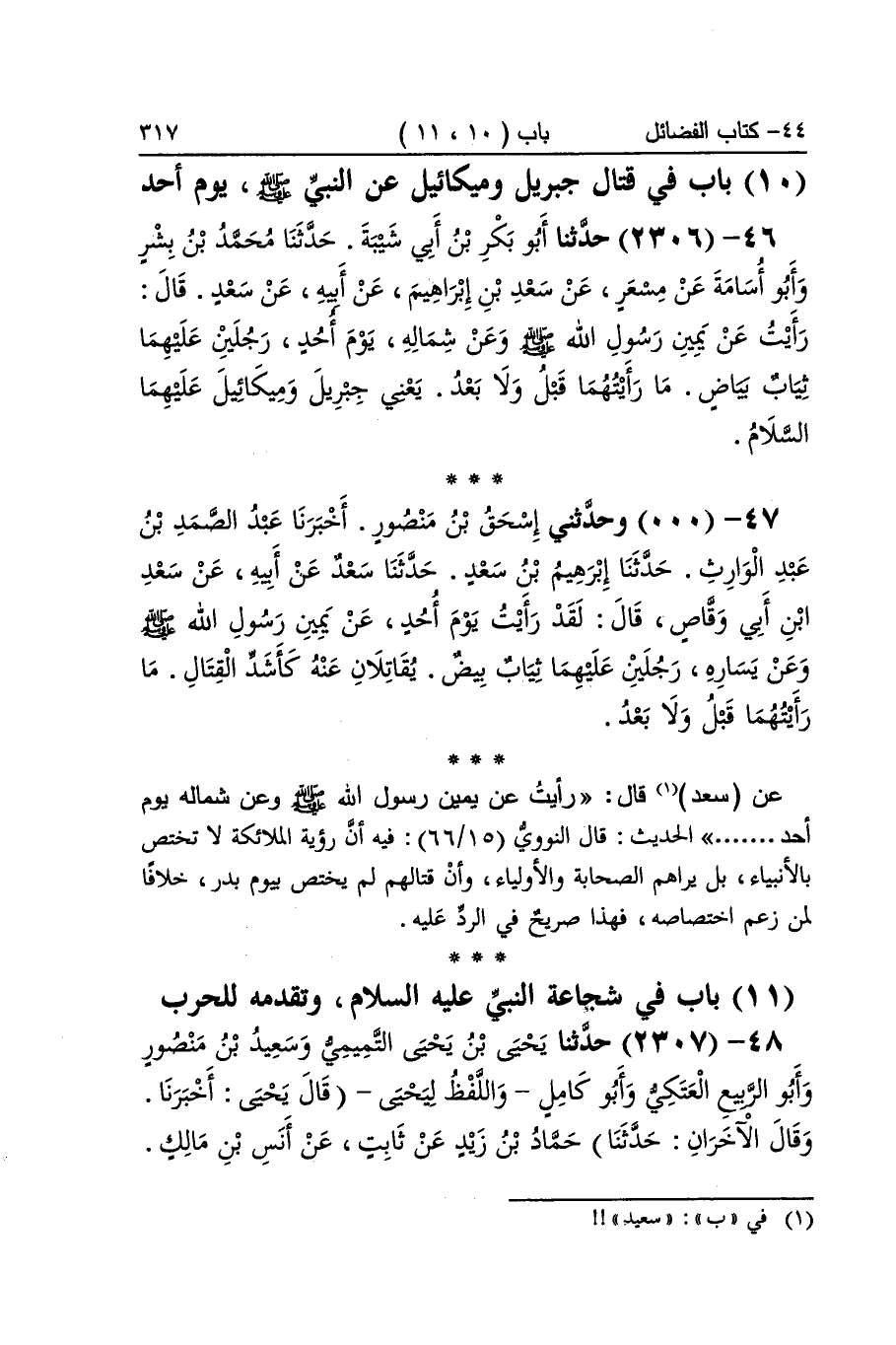 [2306] عَن سعد قَالَ رَأَيْت عَن يَمِين رَسُول الله صلى الله عَلَيْهِ وَسلم وَعَن شِمَاله يَوْم أحد الحَدِيث قَالَ النَّوَوِيّ فِيهِ أَن رُؤْيَة الْمَلَائِكَة لَا تخْتَص بالأنبياء بل يراهم الصَّحَابَة والأولياء وَأَن قِتَالهمْ لم يخْتَص بِيَوْم بدر خلافًا لمن زعم اخْتِصَاصه فَهَذَا صَرِيح فِي الرَّد عَلَيْهِ