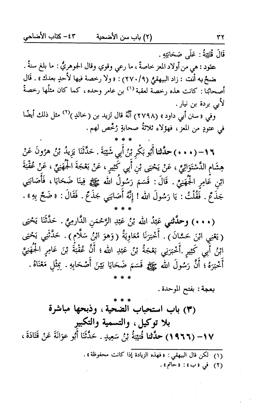 [1965] عتود هِيَ من أَوْلَاد الْمعز خَاصَّة مَا رعي وَقَوي وَقَالَ الْجَوْهَرِي مَا بلغ سنة صَحَّ بِهِ أَنْت زَاد الْبَيْهَقِيّ وَلَا رخصَة فِيهَا لأحد بعْدك قَالَ أَصْحَابنَا كَانَت هَذِه رخصَة لعقبة بن عَامر وَحده كَمَا كَانَ مثلهَا رخصَة لأبي بردة بن نيار وَفِي سنَن أبي دَاوُد 2798 أَنه قَالَ لزيد بن خَالِد مثل ذَلِك أَيْضا فِي عتود من الْمعز فهولاء ثَلَاثَة صحابة رخص لَهُم بعجة بِفَتْح الْمُوَحدَة