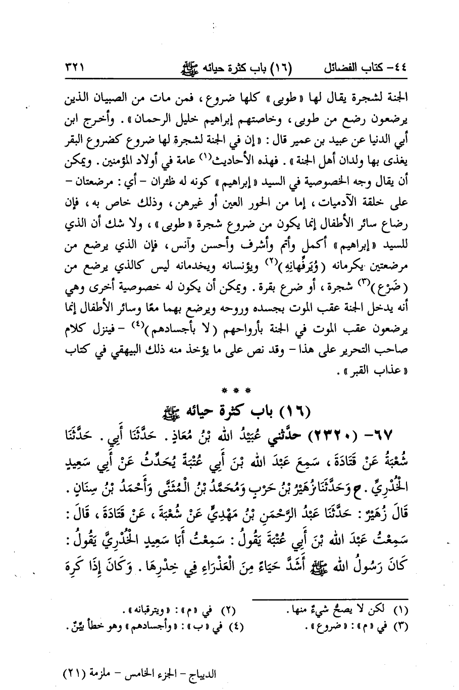 [2316] وَإِن لَهُ ظئرين بِكَسْر الظَّاء مَهْمُوز أَي مرضعتين يكملان رضاعه فِي الْجنَّة أَي يتمانه سنتَيْن قَالَ النَّوَوِيّ قَالَ صَاحب التَّحْرِير وَهَذَا الْإِتْمَام لإرضاع إِبْرَاهِيم عَلَيْهِ السَّلَام يكون عقب مَوته فَيدْخل الْجنَّة مُتَّصِلا بِمَوْتِهِ فَيتم بهَا رضاعه كَرَامَة لَهُ ولأبيه صلى الله عَلَيْهِ وَسلم قلت ظَاهر هَذَا الْكَلَام أَنَّهَا خُصُوصِيَّة لإِبْرَاهِيم وَقد أخرج بن أبي الدُّنْيَا فِي العزاء من حَدِيث بن عمر مَرْفُوعا كل مَوْلُود يُولد فِي الْإِسْلَام فَهُوَ فِي الْجنَّة شبعان رَيَّان يَقُول يَا رب أورد عَليّ أبواي وَأخرج بن أبي الدُّنْيَا وَابْن أبي حَاتِم فِي تَفْسِيره عَن خَالِد بن معدان قَالَ إِن فِي الْجنَّة لشَجَرَة يُقَال لَهَا طُوبَى كلهَا ضروع فَمن مَاتَ من الصّبيان الَّذين يرضعون رضع من طُوبَى وخاصتهم إِبْرَاهِيم خَلِيل الرَّحْمَن وَأخرج بن أبي الدُّنْيَا عَن عبيد بن عُمَيْر قَالَ إِن فِي الْجنَّة لشَجَرَة لَهَا ضروع كضروع الْبَقر يغذى بهَا ولدان أهل الْجنَّة فَهَذِهِ الْأَحَادِيث عَامَّة فِي أولادالمؤمنين وَيُمكن أَن يُقَال وَجه الخصوصية فِي السَّيِّد إِبْرَاهِيم كَونه لَهُ ظئران أَي مرضعتان على خلقَة الآدميات إِمَّا من الْحور الْعين أَو غَيْرهنَّ وَذَلِكَ خَاص بِهِ فَإِن رضَاع سَائِر الْأَطْفَال إِنَّمَا يكون من ضروع شَجَرَة طُوبَى وَلَا شكّ أَن الَّذِي للسَّيِّد إِبْرَاهِيم أكمل وَأتم وأشرف وَأحسن وآنس فَإِن الَّذِي يرضع من مرضعتين يكرمانه ويرفهانه ويؤنسانه ويخدمانه لَيْسَ كَالَّذي يرضع من ضرع شَجَرَة أَو ضرع بقرة ويم أَن يكون لَهُ خُصُوصِيَّة أُخْرَى وَهِي أَنه يدْخل الْجنَّة عقب الْمَوْت بجسده وروحه ويرضع بهما مَعًا وَسَائِر الْأَطْفَال إِنَّمَا يرضعون عقب الْمَوْت فِي الْجنَّة بأرواحهم لَا بأجسادهم فَينزل كَلَام صَاحب التَّحْرِير على هَذَا وَقد نَص على مَا يُؤْخَذ مِنْهُ ذَلِك الْبَيْهَقِيّ فِي كتاب عَذَاب الْقَبْر