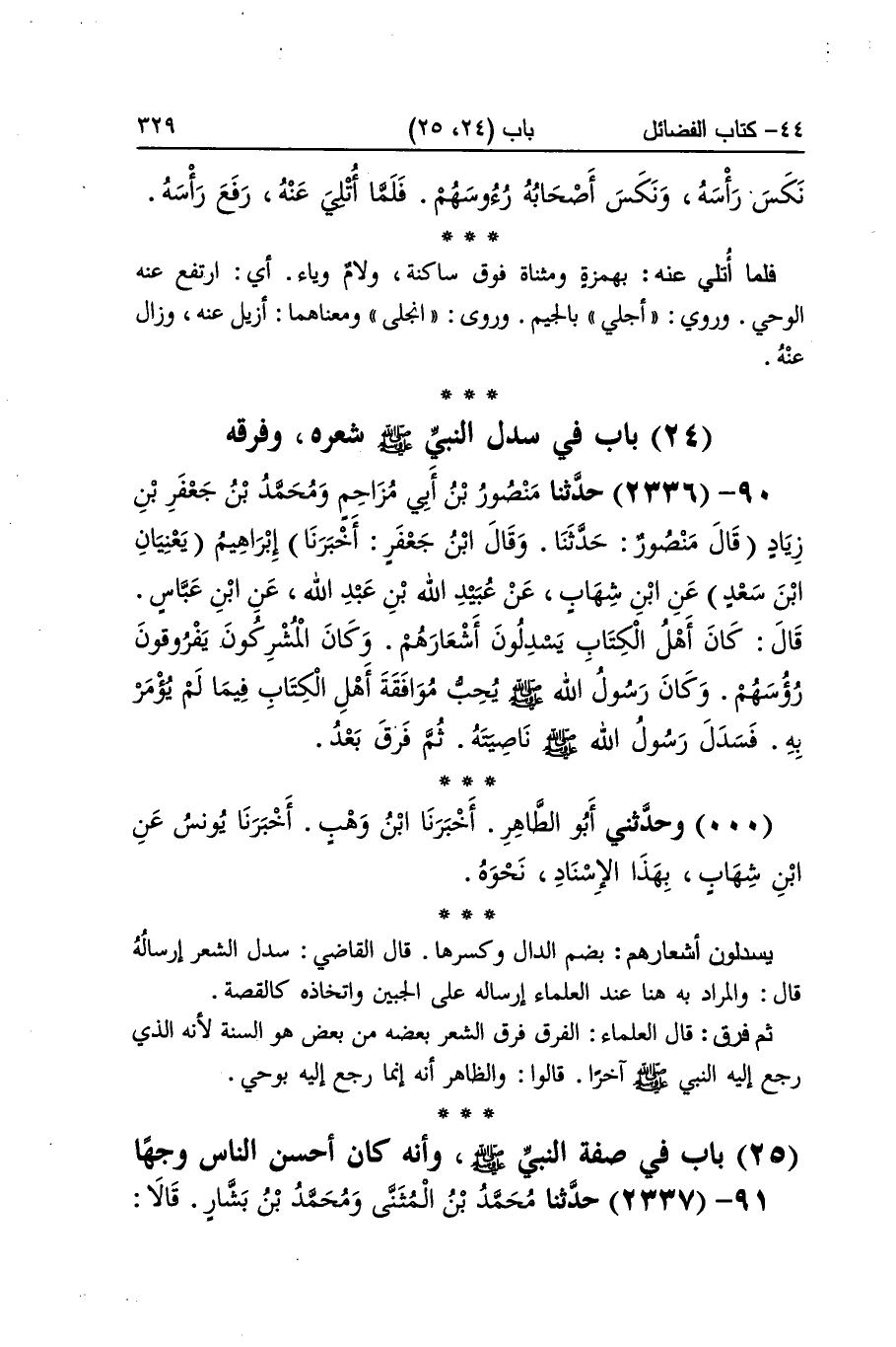 [2336] يسدلون أشعارهم بِضَم الدَّال وَكسرهَا قَالَ القَاضِي سدل الشّعْر إرْسَاله قَالَ والمرادبه هُنَا عِنْد الْعلمَاء إرْسَاله على الجبين واتخاذه كالقصة ثمَّ فرق قَالَ الْعلمَاء الْفرق فرق الشّعْر بعضه من بعض هُوَ السّنة لِأَنَّهُ الَّذِي رَجَعَ إِلَيْهِ النَّبِي صلى الله عَلَيْهِ وَسلم آخرا قَالُوا وَالظَّاهِر أَنه إِنَّمَا رَجَعَ إِلَيْهِ بِوَحْي