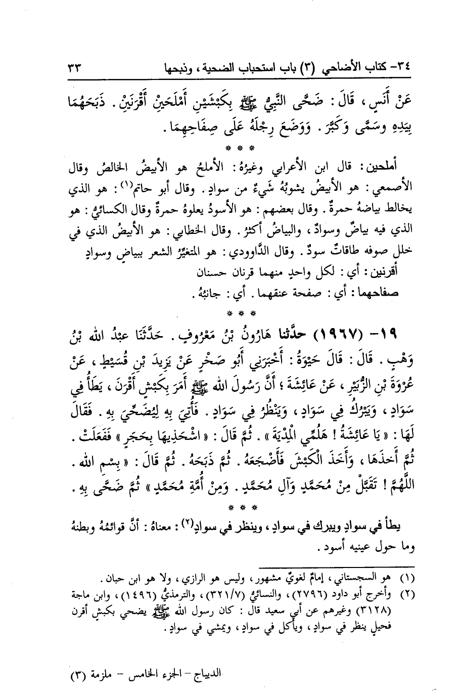[1966] أملحين قَالَ بن الْأَعرَابِي وَغَيره الأملح هُوَ الْأَبْيَض الْخَالِص وَقَالَ الْأَصْمَعِي هُوَ الْأَبْيَض يشوبه شَيْء من سَواد وَقَالَ أَبُو حَاتِم هُوَ الَّذِي يخالط بياضه حمرَة وَقَالَ بَعضهم هُوَ الْأسود يعلوه حمرَة وَقَالَ الْكسَائي هُوَ الَّذِي فِيهِ بَيَاض وَسَوَاد وَالْبَيَاض أَكثر وَقَالَ الْخطابِيّ هُوَ الْأَبْيَض الَّذِي فِي خلل صوفه طاقات سود وَقَالَ الداوودي هُوَ الْمُتَغَيّر الشّعْر ببياض وَسَوَاد أقرنين أَي لكل وَاحِد مِنْهُمَا قرنان حسنان صفاحهما أَي صفحة عنقهما أَي جَانِبه