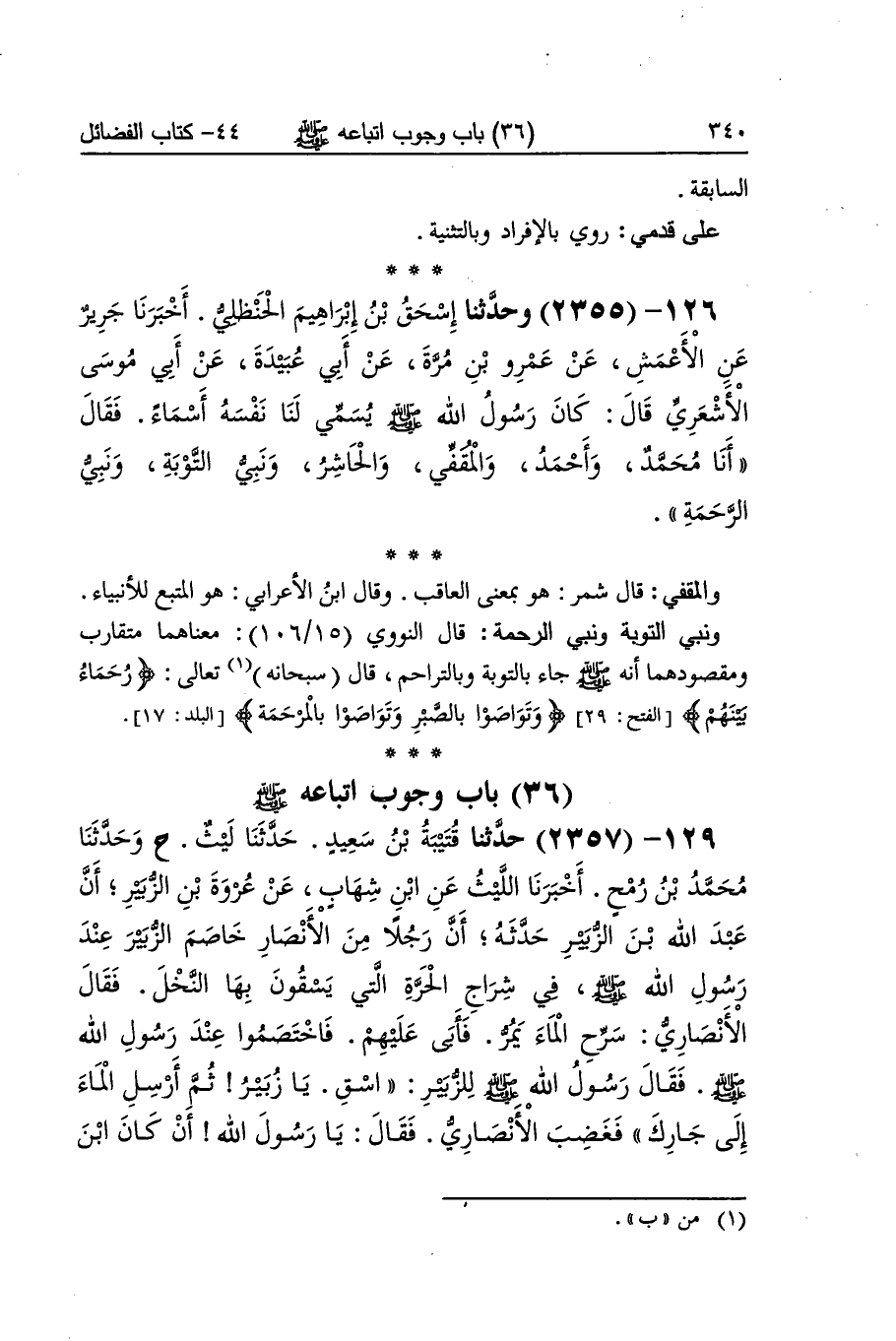 [2355] والمقفي قَالَ شمر هُوَ بِمَعْنى العاقب وَقَالَ بن الْأَعرَابِي هُوَ المتبع للأنبياء وَنَبِي التَّوْبَة وَنَبِي الرَّحْمَة قَالَ النَّوَوِيّ مَعْنَاهُمَا مُتَقَارب ومقصودهما أَنه صلى الله عَلَيْهِ وَسلم جَاءَ بِالتَّوْبَةِ وبالتراحم قَالَ سُبْحَانَهُ تَعَالَى رحماء بَينهم وتواصو بِالصبرِ وَتَوَاصَوْا بالمرحمة الْبَلَد