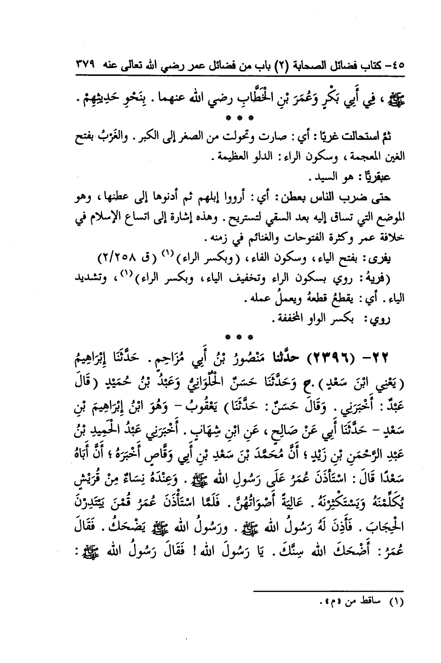 [2393] ثمَّ استحالت غربا أَي صَارَت وتحولت من الصغر إِلَى الْكبر والغرب بِفَتْح الْغَيْن الْمُعْجَمَة وَسُكُون الرَّاء الدَّلْو الْعَظِيمَة عبقريا هُوَ السَّيِّد حَتَّى ضرب النَّاس بِعَطَن أَي أرووا إبلم ثمَّ أدنوها إِلَى عطنها وَهُوَ الْموضع الَّتِي تساق إِلَيْهِ بعد السَّقْي لتستريح وَهَذِه إِشَارَة إِلَى اتساع الْإِسْلَام فِي خلَافَة عمر وَكَثْرَة الفتوحات والغنائم فِي زَمَنه يفرى بِفَتْح الْيَاء وَسُكُون الْفَاء وبكسر الرَّاء فريه رُوِيَ بِسُكُون الرَّاء وَتَخْفِيف الْيَاء وبكسر الرَّاء وَتَشْديد الْيَاء أَي يقطع قطعه وَيعْمل عمله رُوِيَ بِكَسْر الْوَاو المخففة