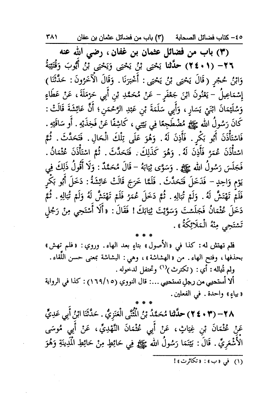 [2401] فَلم تهتش لَهُ كَذَا فِي الْأُصُول بتاء بعد الْهَاء وَرُوِيَ فَلم تهش بحذفها وَفتح الْهَاء من الهشاشة وَهِي البشاشة بِمَعْنى حسن اللِّقَاء وَلم تباله أَي تكترث وتحتفل لدُخُوله أَلا أستحيي من رجل تستحيي قَالَ النَّوَوِيّ كَذَا فِي الرِّوَايَة بياء وَاحِدَة فِي الْفِعْلَيْنِ
