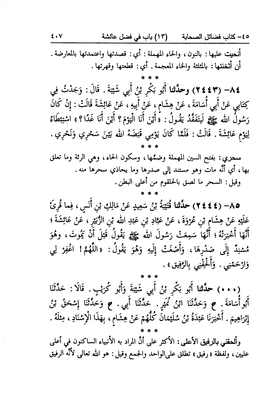 [2442] تساميني أَي تعادلني وتضاهيني فِي الحظوة والمنزلة الرفيعة مَا عدا سُورَة بِفَتْح السِّين الْمُهْملَة وَسُكُون الْوَاو ثمَّ رَاء وهاء وَهُوَ الثوران وعجلة الْغَضَب من حد كَذَا فِي أَكثر الْأُصُول بِلَا هَاء وَفِي بَعْضهَا من حِدة بِكَسْر الْحَاء وبالهاء وَهِي شدَّة الْخلق وَالْمعْنَى أَنَّهَا كَامِلَة الْأَوْصَاف إِلَّا أَن فِيهَا شدَّة خلق وَسُرْعَة غضب تسرع مِنْهَا الْفَيْئَة بِفَتْح الْفَاء وبالهمز وَهِي الرُّجُوع إِذا وَقع ذَلِك مِنْهَا رجعت سَرِيعا وَلَا تصر عَلَيْهِ قَالَ النَّوَوِيّ وَقد صحف صَاحب التَّحْرِير فِي هَذَا الحَدِيث تصحيفا قبيحا جدا فَقَالَ مَا عدا سَوْدَة بِالدَّال وَجعلهَا سَوْدَة بنت زَمعَة قَالَ وَهَذَا من فَاحش الْغَلَط نبهت عَلَيْهِ لِئَلَّا يغتر بِهِ لم أنشبها أَي لم أمهلها حِين وَفِي نُسْخَة حَتَّى أنحيت عَلَيْهَا بالنُّون والحاء الْمُهْملَة أَي قصدتها واعتمدتها بالمعارضة أَن أثخنتها بِالْمُثَلثَةِ وَالْخَاء الْمُعْجَمَة أَي قطعتها وقهرتها