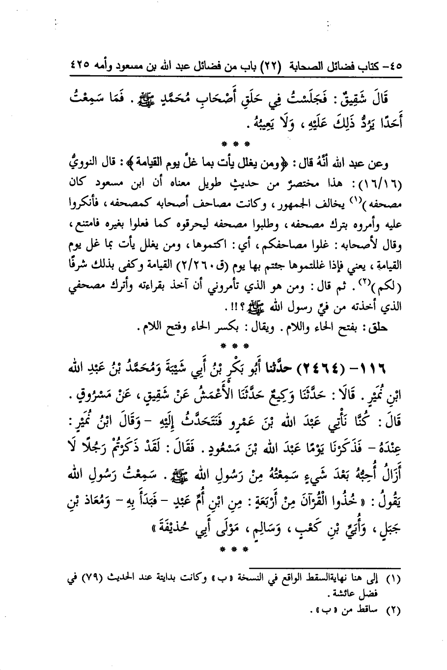 [2462] وَعَن عبد الله أَنه قَالَ وَمن يغلل يَأْتِ بِمَا غل يَوْم الْقِيَامَة قَالَ النَّوَوِيّ هَذَا مُخْتَصر من حَدِيث طَوِيل مَعْنَاهُ أَن بن مَسْعُود كَانَ مصحفه يُخَالف الْجُمْهُور وَكَانَت مصاحف أَصْحَابه كمصحفه فأنكروا عَلَيْهِ وأمروه بترك مصحفه وطلبوا مصحفه ليحرقوه كَمَا فعلوا بِغَيْرِهِ فَامْتنعَ وَقَالَ لأَصْحَابه غلوا مصاحفكم أَي اكتموها وَمن يغلل يَأْتِ بِمَا غل يَوْم الْقِيَامَة يَعْنِي فَإِذا غللتموها جئْتُمْ بهَا يَوْم الْقِيَامَة وَكفى بذلك شرفا لكم ثمَّ قَالَ وَمن هُوَ الَّذِي تأمروني أَن آخذ بقرَاءَته وأترك مصحفي الَّذِي أَخَذته من فِي رَسُول الله صلى الله عَلَيْهِ وَسلم حلق بِفَتْح الْحَاء وَاللَّام وَيُقَال بِكَسْر الْحَاء وَفتح اللَّام
