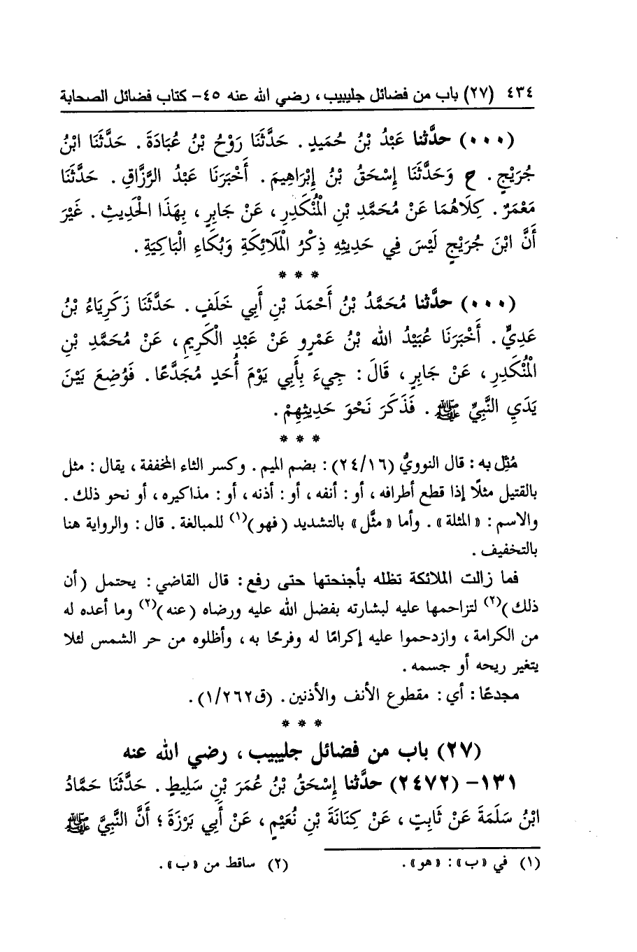 [2471] مثل بِهِ قَالَ النَّوَوِيّ بِضَم الْمِيم وَكسر الثَّاء المخففة يُقَال مثل بالقتيل مثلا إِذا قطع أَطْرَافه أَو أَنفه أَو أُذُنه أَو مذاكيره أَو نَحْو ذَلِك وَالِاسْم الْمثلَة وَأما مثل بِالتَّشْدِيدِ فَهُوَ للْمُبَالَغَة قَالَ وَالرِّوَايَة هُنَا بِالتَّخْفِيفِ فَمَا زَالَت الْمَلَائِكَة تظله بأجنحتها حَتَّى رفع قَالَ القَاضِي يحْتَمل أَن ذَلِك لتزاحمها عَلَيْهِ لبشارته بِفضل الله عَلَيْهِ وَرضَاهُ عَنهُ وَمَا أعده لَهُ من الْكَرَامَة وازدحموا عَلَيْهِ إِكْرَاما لَهُ وفرحا بِهِ وأظلوه من حر الشَّمْس لِئَلَّا يتَغَيَّر رِيحه أَو جِسْمه مجدعا أَي مَقْطُوع الْأنف والأذنين