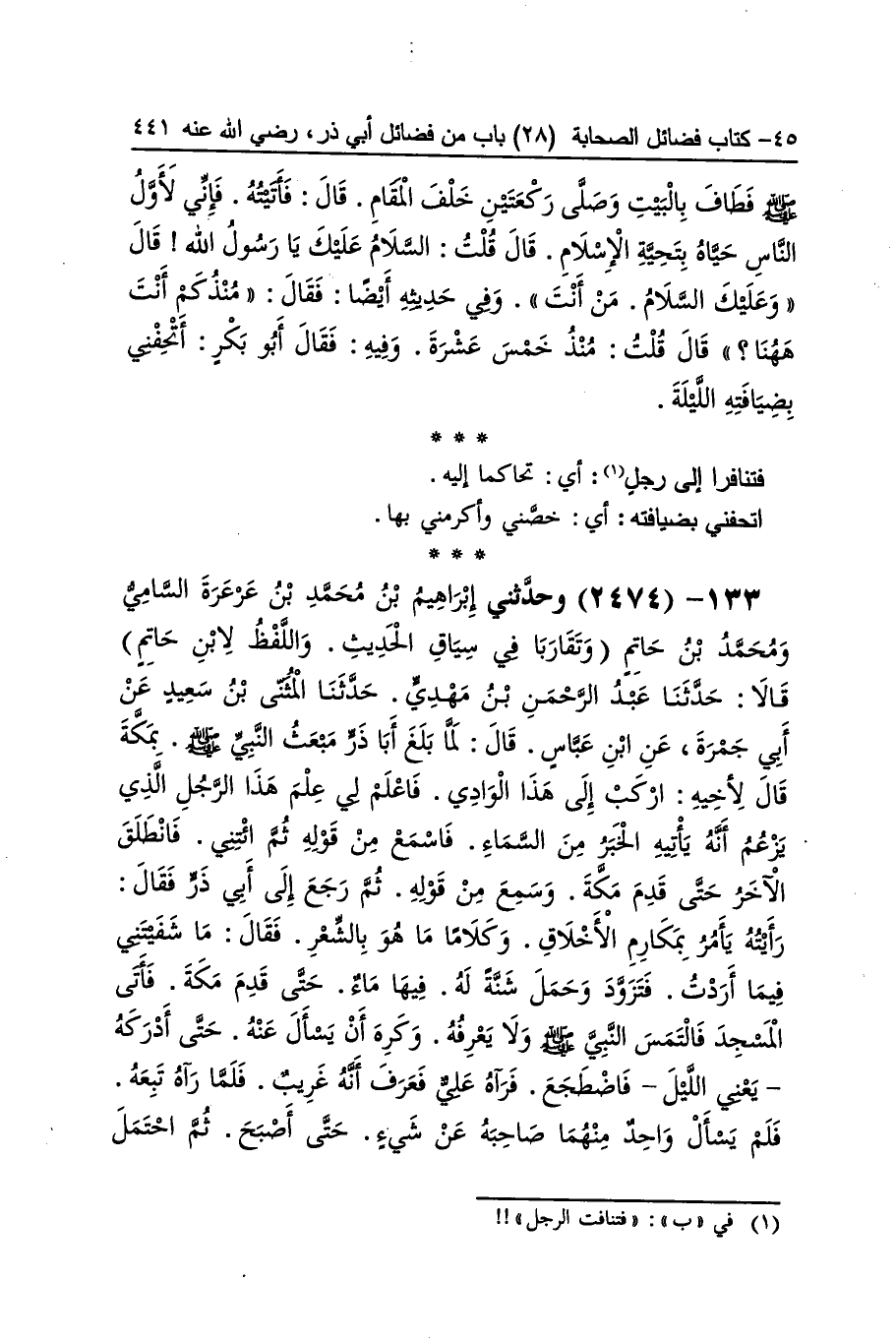 [2473] فَنَثَا علينا بنُون ثمَّ مُثَلّثَة أَي أشاع وَأفْشى صِرْمَتنَا بِكَسْر الصَّاد وَهِي الْقطعَة من الْإِبِل وَتطلق أَيْضا على الْقطعَة من الْغنم فنافر أنيس إِلَى آخِره أَي تراهن هُوَ وَآخر أَيهمَا أشعر وَكَانَ الرَّهْن صرمة ذَا وصرمة ذَاك فَأَيّهمَا كَانَ أفضل أَخذ الصرمتين فتحاكما إِلَى الكاهن فَحكم أَن أنيسا أفضل وَهُوَ معنى قَوْله فَخير أنيسا أَي جعله الْخِيَار وَالْأَفْضَل كَأَنِّي خَفَاء بِكَسْر الْخَاء الْمُعْجَمَة وَتَخْفِيف الْفَاء وَالْمدّ وَهُوَ الكساء وَرُوِيَ بجيم مَضْمُومَة وَهُوَ غثاء السَّيْل فَرَاثَ أَي أَبْطَأَ أَقراء الشّعْر بِالْقَافِ وَالرَّاء وَالْمدّ أَي طرقه وأنواعه فَتَضَعَّفْت رجلا مِنْهُم أَي نظرت إِلَى أضعفهم فَسَأَلته لِأَن الضَّعِيف مَأْمُون الغائلة غَالِبا وَلابْن ماهان فتضيفت بِالْيَاءِ وأنكرها القَاضِي وَغَيره وَقَالُوا لَا وَجه لَهَا هُنَا كَأَنِّي نصب أَحْمَر بِضَم الصَّاد وسكونها وَاحِد الأنصاب وَهِي حِجَارَة كَانَت الْجَاهِلِيَّة تنصبها وتذبح عِنْدهَا يَعْنِي من كَثْرَة الدِّمَاء الَّتِي سَأَلت مِنْهُ بضربهم تَكَسَّرَتْ عُكَن بَطْني أَي انْثَنَتْ لِكَثْرَة السّمن وانطوت سخْفَة جوع بِفَتْح السِّين الْمُهْملَة وَضمّهَا وَسُكُون الْخَاء الْمُعْجَمَة وَهِي رقة الْجُوع وَضَعفه وهزاله فِي لَيْلَة قَمْرَاء أَي مُقْمِرَة طالع قمرها إِضْحِيَان بِكَسْر الْهمزَة والحاء وَسُكُون الضَّاد الْمُعْجَمَة بَينهمَا أَي مضيئة إِذْ ضرب على أسمختهم جمع سماخ وَهُوَ الْخرق الَّذِي فِي الْأذن وَيُقَال بِالسِّين وبالصاد وَهُوَ أفْصح وَالْمرَاد هُنَا آذانهم أَي نَامُوا وَامْرَأَتَانِ فِي نُسْخَة وَامْرَأَتَيْنِ على تَقْدِير وَرَأَيْت فَمَا تناهتا عَن قَوْلهمَا أَي مَا انتهتا عَنهُ بل دامتا عَلَيْهِ وَفِي نُسْخَة فَمَا تناهتا على قَوْلهمَا أَي عَن الدَّوَام على قَوْلهمَا فَقلت هن مثل الْخَشَبَة غير أَنِّي لَا أكنى أَي قَالَ لَهما ذكر فِي الْفرج وَأَرَادَ بذلك سبّ إساف ونائلة وغيظ الْكفَّار بذلك تُوَلْوِلَانِ أَي تدعوان بِالْوَيْلِ لَو كَانَ هَا هُنَا أحد من أَنْفَارنَا جمع نفر ونفير وَهُوَ الَّذِي ينفر عِنْد الاستغاثة وَرُوِيَ من أنصارنا وَجَوَاب لَو مَحْذُوف أَي لانتصر لنا كلمة تملأ الْفَم أَي عَظِيمَة لَا شَيْء أقبح مِنْهَا كالشيء الَّذِي يمْلَأ الشَّيْء فَلَا يسع غَيره وَقيل مَعْنَاهُ لَا يُمكن ذكرهَا وحكايتها لِأَنَّهَا تسد فَم حاكيها وتملؤه لاستعظامها فقدعني بِالدَّال الْمُهْملَة أَي كفني وَمَنَعَنِي طَعَام طعم بِضَم الطَّاء وَسُكُون الْعين أَي تشبع شاربها كَمَا يشبعه الطَّعَام غبرت مَا غبرت بقيت مَا بقيت قد وجهت لي الأَرْض أَي أريت جِهَتهَا لَا أَرَاهَا ضبط بِضَم الْهمزَة وَفتحهَا مَا بِي رَغْبَة عَن دينكما أَي لَا أكرهه بل أَدخل فِيهِ فَاحْتَمَلْنَا يَعْنِي حملنَا أَنْفُسنَا ومتاعنا على الْإِبِل إِيمَاء بِكَسْر الْهمزَة وَحكي فتحهَا وبالمد بن رحضة برَاء وحاء وصاد مفتوحات شنفوا لَهُ بِفَتْح الشين الْمُعْجَمَة وَكسر النُّون وَفَاء أَي أبغضوه وتجهموا أَي قابلوه بِوُجُوه كريهة غَلِيظَة فتنافرا إِلَى رجل أَي تحاكما إِلَيْهِ اتحفني بضيافته أَي خصني وأكرمني بهَا