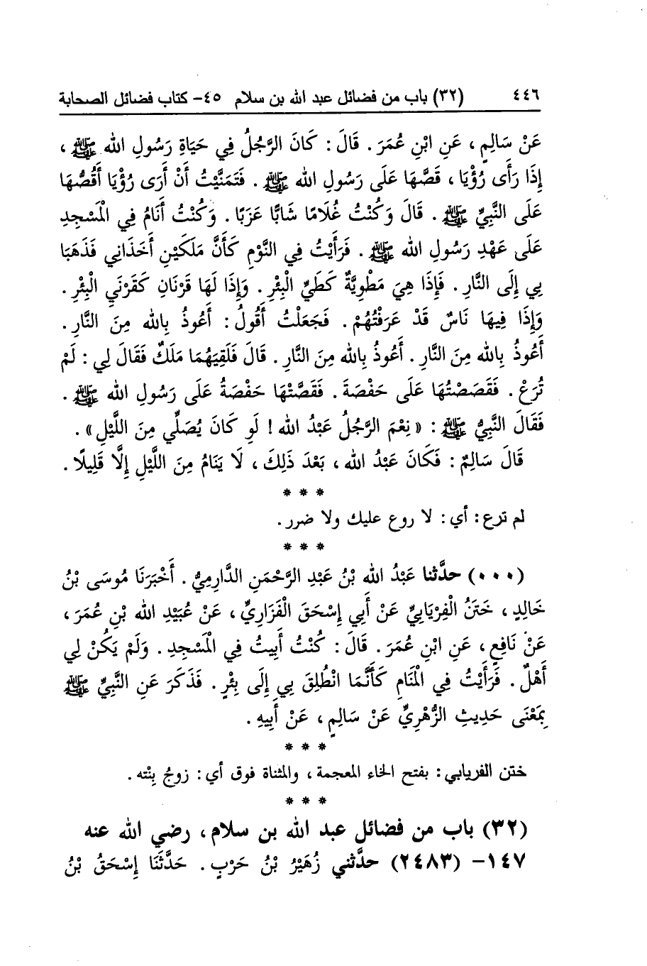 [2479] لم ترع أَي لَا روع عَلَيْك وَلَا ضَرَر ختن الْفرْيَابِيّ بِفَتْح الْخَاء الْمُعْجَمَة والمثناة فَوق أَي زوج بنته