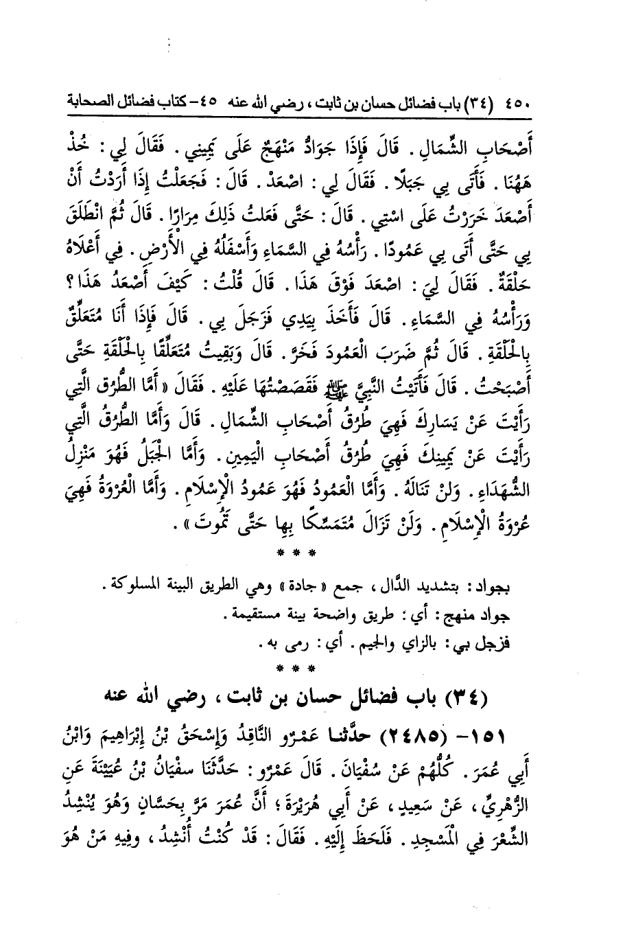 [2484] فصلى رَكْعَتَيْنِ فِيهَا قَالَ النَّوَوِيّ فِيهِ نقص لَفْظَة ثبتَتْ فِي البُخَارِيّ وَهِي رَكْعَتَيْنِ تجوز فيهمَا مَا يَنْبَغِي لأحد أَن يَقُول مَا لَا يعلم قَالَ النَّوَوِيّ يحْتَمل أَنه لم يسمع خبر سعد وَيحْتَمل أَنه كره الثَّنَاء عَلَيْهِ بذلك تواضعا وإيثارا للخمول وَكَرَاهَة للشهرة منصف بِكَسْر الْمِيم وَفتح الصَّاد وَيُقَال بِفَتْح الْمِيم أَيْضا فرقيت رُوِيَ بِكَسْر الْقَاف وَفتحهَا لُغَتَانِ الوصيف هُوَ الصَّغِير الْمدْرك للْخدمَة بجواد بتَشْديد الدَّال جمع جادة وَهِي الطَّرِيق الْبَيِّنَة المسلوكة جواد مَنْهَج أَي طَرِيق وَاضِحَة بَيِّنَة مُسْتَقِيمَة فزجل بِي بالزاي وَالْجِيم أَي رمى بِهِ