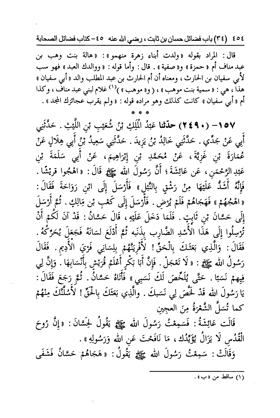 [2489] ائْذَنْ لي فِي أبي سُفْيَان قَالَ النَّوَوِيّ المُرَاد بِهِ بن الْحَارِث بن عبد الْمطلب وَهُوَ بن عَم النَّبِي صلى الله عَلَيْهِ وَسلم وَكَانَ إِذْ ذَاك شَدِيدا على النَّبِي صلى الله عَلَيْهِ وَسلم وَالْمُسْلِمين ثمَّ أسلم وَحسن إِسْلَامه وَإِن سَنَام الْمجد من آل هَاشم بَنو بنت مَخْزُوم ووالدك العَبْد قَالَ النَّوَوِيّ بنت مَخْزُوم هِيَ فَاطِمَة بنت عَمْرو بن عَائِذ بن عمرَان بن مَخْزُوم أم عبد الله وَالِد النَّبِي صلى الله عَلَيْهِ وَسلم وأخويه الزبير وَأبي طَالب قَالَ وَبعد هَذَا الْبَيْت بَيت لم يذكرهُ مُسلم وبذكره تتمّ الْفَائِدَة وَالْمرَاد وَهُوَ وَمن ولدت أَبنَاء زهرَة منهمو كرام وَلم يقرب عجائزك الْمجد قَالَ المُرَاد بقوله ولدت أَبنَاء زهرَة منهمو هَالة بنت وهب بن عبد منَاف أم حَمْزَة وَصفِيَّة قَالَ وَأما قَوْله ووالدك العَبْد فَهُوَ سبّ لأبي سُفْيَان بن الْحَارِث وَمَعْنَاهُ أَن أم الْحَارِث بن عبد الْمطلب وَالِد أبي سُفْيَان هَذَا هِيَ سميَّة بنت موهب وموهب غُلَام لبني عبد منَاف وَكَذَا أم أبي سُفْيَان كَانَت كَذَلِك وَهُوَ مُرَاده قَوْله وَلم يقرب عجائزك الْمجد