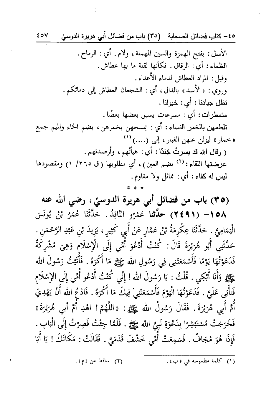 [2490] رشق بالنل بِفَتْح الرَّاء أَي الرَّمْي بهَا قد آن لكم أَي حَان لكم أَن تُرْسِلُوا إِلَى هَذَا الْأسد الضَّارِب بِذَنبِهِ قَالَ الْعلمَاء المُرَاد بِذَنبِهِ هُنَا لِسَانه فَشبه نَفسه بالأسد فِي انتفاخه وبطشه إِذا اغتاظ وَحِينَئِذٍ يضْرب بِذَنبِهِ جَنْبَيْهِ كَمَا فعل حسان بِلِسَانِهِ حِين أدلعه فَجعل يحركه فَشبه نَفسه بالأسد وَلسَانه بِذَنبِهِ ثمَّ أدلع لِسَانه أَي أخرجه عَن الشفتين لأفرينهم بلساني فري الْأَدِيم أَي لأمزقن أعراضهم تمزيق الْجلد لأسلنك مِنْهُم كَمَا تسل الشعرة من الْعَجِين أَي لأتلطفن فِي تَخْلِيص نسبك فِي هجوهم بِحَيْثُ لَا يبْقى جُزْء من نسبك فِي نسبهم الَّذِي ناله الهجو كَمَا أَن الشعرة إِذا استلت من الْعَجِين لَا يبْقى مِنْهَا شَيْء فشفى واشتفى أَي شفى الْمُؤمنِينَ واشتفى هُوَ بِمَا ناله من أَعْرَاض الْكفَّار برا أَي وَاسع الْخَيْر والنفع وَقيل منزها عَن الْإِثْم شيمته أَي خلقه فَإِن أبي ووالده وعرضي احْتج بِهِ بن قُتَيْبَة لمذهبه أَن عرض الْإِنْسَان هُوَ نَفسه لَا أسلافه لِأَنَّهُ ذكر عرضه وأسلافه بالْعَطْف وَقَالَ غَيره عرض الْإِنْسَان وأموره كلهَا الَّتِي يحمد بهَا ويذم من نَفسه وأسلافه وكل مَا لحقه نقص بِعَيْبِهِ وقاء بِكَسْر الْوَاو وبالمد هُوَ مَا وقيت بِهِ الشَّيْء ثكلت بنيتي أَي فقدت نَفسِي تثير النَّقْع أَي ترفع الْغُبَار وتهيجه من كنفي كداء بِفَتْح النُّون أَي جَانِبي كداء بِفَتْح الْكَاف وَالْمدّ وَهِي ثنية على بَاب مَكَّة قَالَ النَّوَوِيّ وعَلى هَذِه الرِّوَايَة فِي هَذَا الْبَيْت إقواء مُخَالف لباقيها وَفِي نُسْخَة موعدها كداء يبارين الأعنة وَرُوِيَ ينازعن الأعنة قَالَ القَاضِي الأول هُوَ رِوَايَة الْأَكْثَرين وَمَعْنَاهُ أَنَّهَا لصرامتها وَقُوَّة نفوسها تباري أعنتها بِقُوَّة جبذها لَهَا وَهِي منازعتها لَهَا أَيْضا قَالَ وَرُوِيَ يبارين الأسنة وَهِي الرماح فَإِن صحت فمعناها يضاهين قوامها واعتدالها مصعدات أَي مقبلات إِلَيْكُم ومتوجهات على أكتافها بِالْمُثَنَّاةِ فَوق الأسل بِفَتْح الْهمزَة وَالسِّين الْمُهْملَة وَلَام أَي الرماح الظماء أَي الرقَاق فَكَأَنَّهَا لقلَّة مَا بهَا عطاش وَقيل المُرَاد العطاش لدماء الْأَعْدَاء وَرُوِيَ الْأسد بِالدَّال أَي الشجعان العطاش إِلَى دمائكم تظل جيادنا أَي خيولنا متمطرات أَي مسرعات يسْبق بَعْضهَا بَعْضًا تلطمهن بِالْخمرِ النِّسَاء أَي يمسحهن بِخُمُرِهِنَّ بِضَم الْخَاء وَالْمِيم جمع خمار ليزلن عَنْهُن الْغُبَار إِلَى وَقَالَ الله قد يسرت جندا أَي هيأتهم وأرصدتهم عرضتها اللِّقَاء بصم الْعين أَي مطلوبها ومقصودها لَيْسَ لَهُ كفاء أَي مماثل وَلَا مقاوم