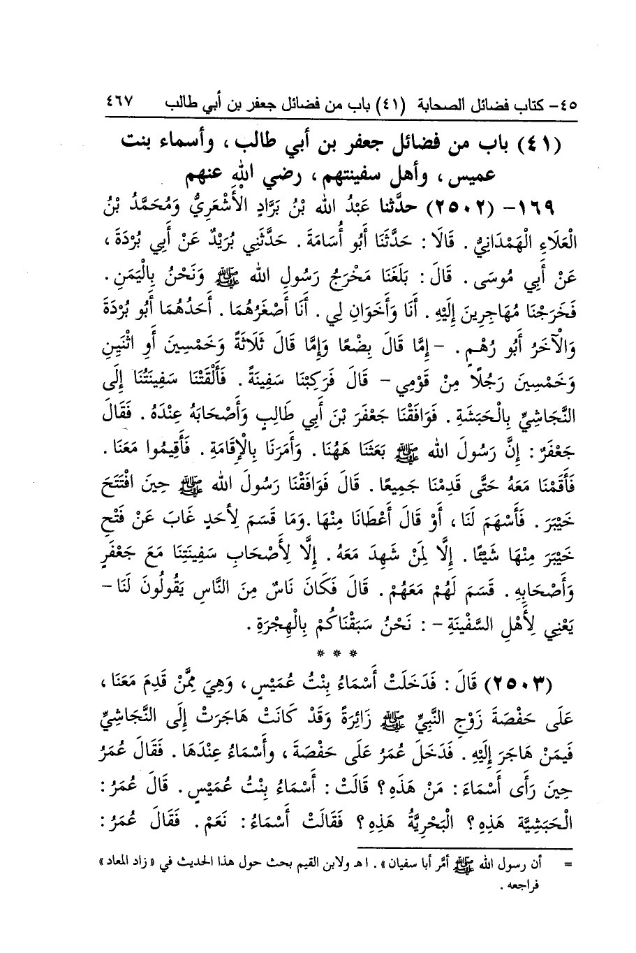 [2501] يَا نَبِي الله ثَلَاث أعطنيهن الحَدِيث قَالَ النَّوَوِيّ هَذَا من الْأَحَادِيث الْمَشْهُورَة بالإشكال لِأَن أَبَا سُفْيَان أسلم عَام الْفَتْح سنة ثَمَان بِلَا خلاف وَكَانَ النَّبِي صلى الله عَلَيْهِ وَسلم قد تزوج أم حَبِيبَة قبل ذَلِك بِزَمَان سنة سِتّ وَقيل سنة سبع وَهِي بِأَرْض الْحَبَشَة وَعقد عقدهَا عُثْمَان وَقيل خَالِد بن سعيد بن الْعَاصِ بِإِذْنِهَا وَقيل النَّجَاشِيّ لِأَنَّهُ أَمِير الْموضع وسلطانه قَالَ القَاضِي وَالَّذِي فِي مُسلم هُنَا انه زَوجهَا أَبُو سُفْيَان وَهُوَ غَرِيب جدا وَقَالَ بن حزم هَذَا الحَدِيث وهم من بعض الروَاة بل مَوْضُوع والآفة فِيهِ من عِكْرِمَة بن عمار لِأَنَّهُ لَا خلاف أَنه صلى الله عَلَيْهِ وَسلم تزَوجهَا قبل الْفَتْح بدهر وَهِي بِأَرْض الْحَبَشَة وأبوها كَافِر قَالَ النَّوَوِيّ وَأنكر بن الصّلاح هَذَا على بن حزم وَبَالغ فِي الشناعة عَلَيْهِ وَقَالَ لَا نعلم أحدا من أهل الْعلم نسب عِكْرِمَة إِلَى وضع الحَدِيث وَقد وَثَّقَهُ وَكِيع وَابْن معِين وَغَيرهمَا وَقَالَ والْحَدِيث مؤول على أَنه سَأَلَهُ تَجْدِيد عقد النِّكَاح تطييبا لِقَلْبِهِ حَيْثُ لم يباشره أَولا قَالَ النَّوَوِيّ وَلَيْسَ فِي الحَدِيث أَنه جدد العقد فَلَعَلَّهُ صلى الله عَلَيْهِ وَسلم أَرَادَ بقوله نعم إِن مقصودك يحصل وَإِن لم يكن بِحَقِيقَة عقد