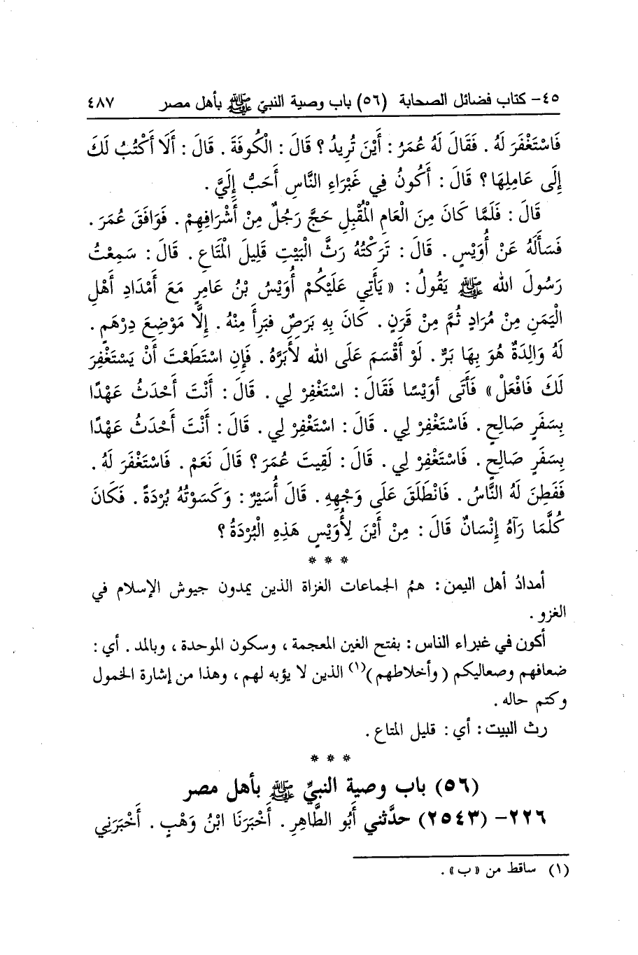 [2542] يسخر بأويس أَي يحقره ويستهزئ بِهِ أَمْدَاد أهل الْيمن هم الْجَمَاعَات الْغُزَاة الَّذين يمدون جيوش الْإِسْلَام فِي الْغَزْو أكون فِي غبراء النَّاس بِفَتْح الْغَيْن الْمُعْجَمَة وَسُكُون الْمُوَحدَة وبالمد أَي ضعافهم وصعاليكهم وأخلاطهم الَّذين لَا يؤبه لَهُم وَهَذَا من إِشَارَة الخمول وكتم حَاله رث الْبَيْت أَي قَلِيل الْمَتَاع