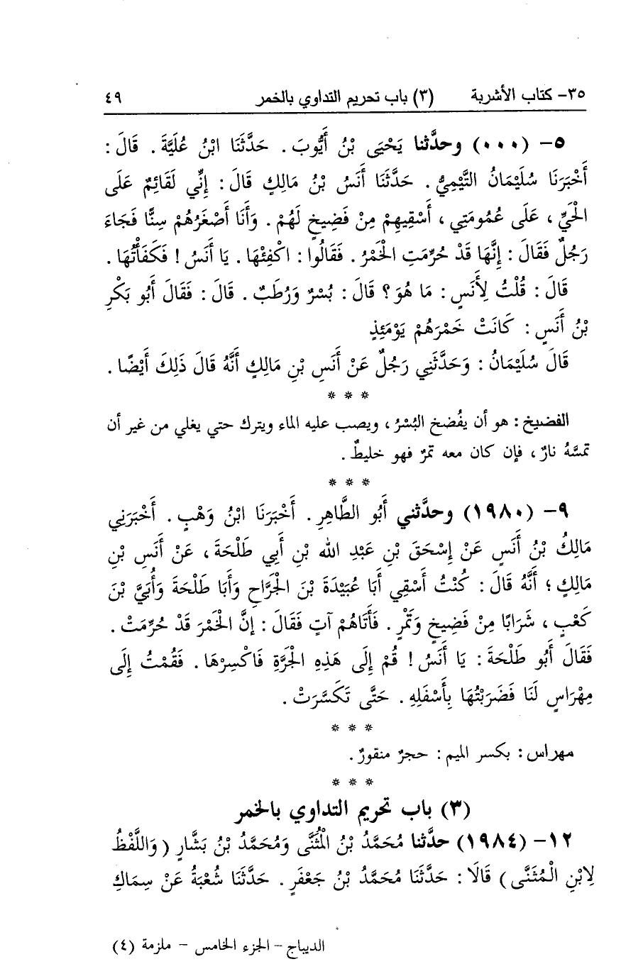 [1980] الفضيخ هُوَ أَن يفضخ الْبُسْر وَيصب عَلَيْهِ المَاء وَيتْرك حَتَّى يغلي من غير أَن تمسه نَار فَإِن كَانَ مَعَه تمر فَهُوَ خليط مهراس بِكَسْر الْمِيم حجر منقور