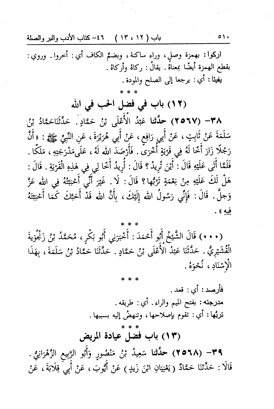 [2565] تفتح أَبْوَاب الْجنَّة يَوْم الْإِثْنَيْنِ قيل هُوَ على ظَاهره وَقيل كِنَايَة عَن كَثْرَة الصفح والغفران وَرفع الْمنَازل وَإِعْطَاء الثَّوَاب الجزيل شَحْنَاء أَي عَدَاوَة أنظروا بِالْقطعِ أَي أخروا اركوا بِهَمْزَة وصل وَرَاء سَاكِنة وَضم الْكَاف أَي أخروا وَرُوِيَ بِقطع الْهمزَة أَيْضا بِمَعْنَاهُ يُقَال ركاه وأركاه يفيئا أَي يرجعا إِلَى الصُّلْح والمودة