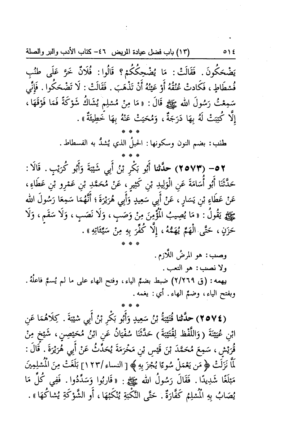 [2573] وصب هُوَ الْمَرَض اللَّازِم وَلَا نصب هُوَ التَّعَب يهمه ضبط بِضَم الْيَاء وَفتح الْهَاء على مَا لم يسم فَاعله وبفتح الْيَاء وَضم الْهَاء أَي يغمه