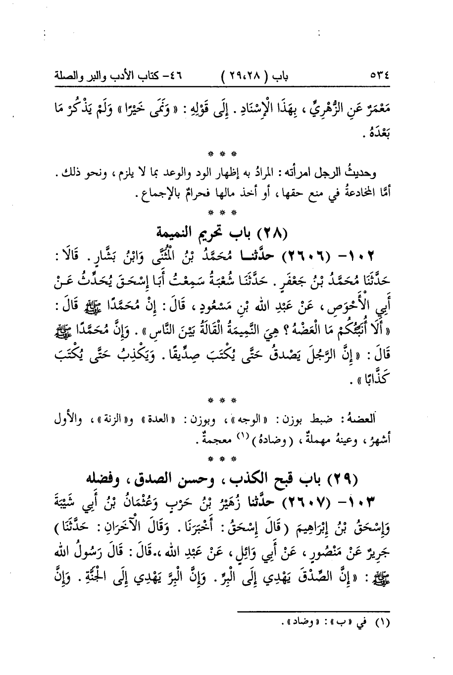 [2606] العضه ضبط بِوَزْن الْوَجْه وبوزن الْعدة والزنة وَالْأول أشهر وعينه مُهْملَة وضاده مُعْجمَة