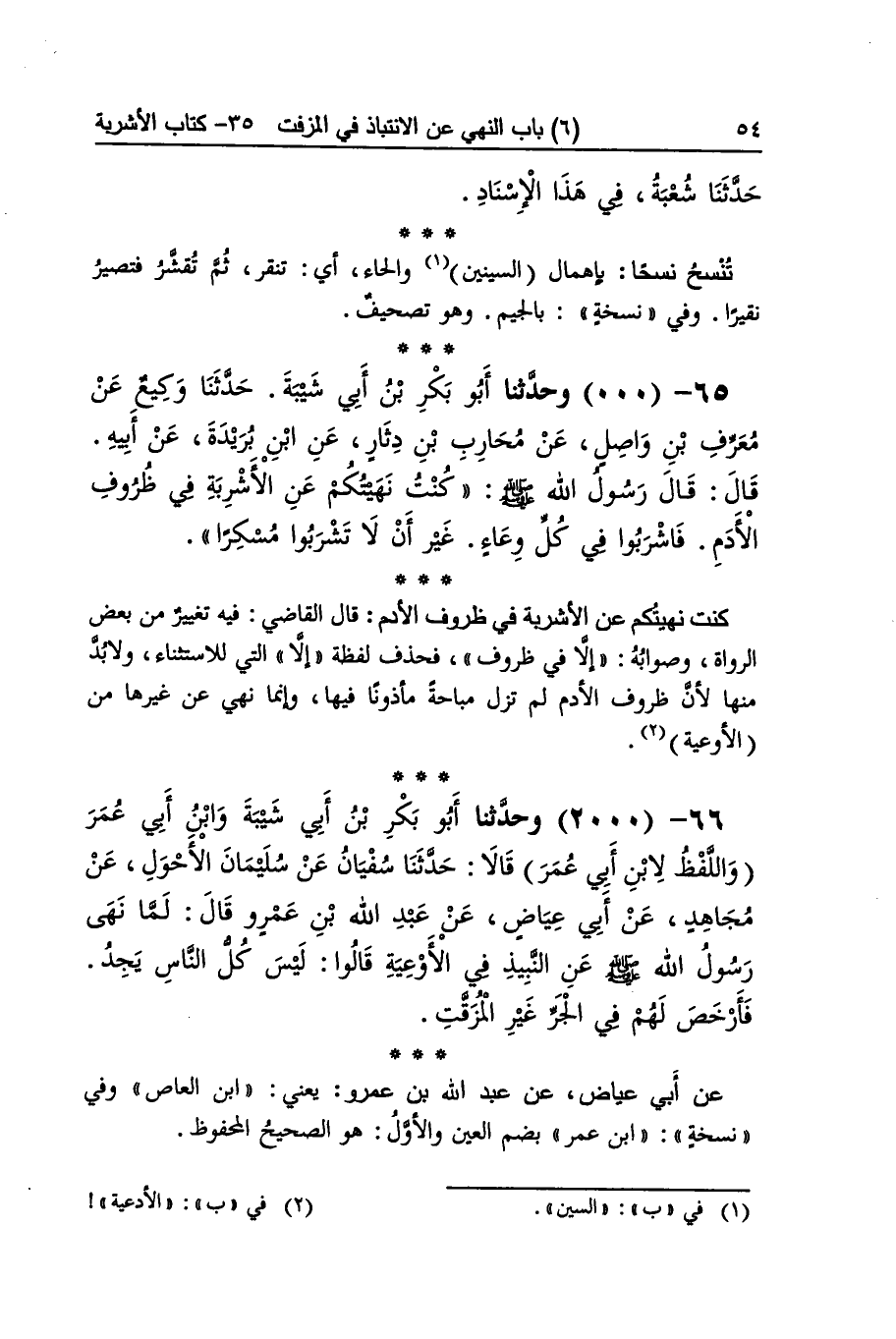 [1990] جرش بِضَم الْجِيم وَفتح الرَّاء بَلْدَة بِالْيمن والحنتم المزادة المجبوبة فِي نُسْخَة والمزادة بواو الْعَطف قَالَ القَاضِي وَهُوَ الصَّوَاب وَالْأول تَغْيِير وَوهم وَفِي رِوَايَة النَّسَائِيّ وَعَن الحنتم وَعَن المجبوبة وَهِي بِالْجِيم وَالْمُوَحَّدَة المكررة الَّتِي قطع رَأسهَا فَصَارَت كَهَيئَةِ الدن وَقيل الَّتِي قطع رَأسهَا وَلَيْسَ لَهَا عزلاء من أَسْفَلهَا تنفس الشَّرَاب مِنْهَا فَيصير شرابها مُسكرا وَلَا يدرى بِهِ وَرَوَاهُ بَعضهم المخنوثة بخاء مُعْجمَة وَنون وثاء مُثَلّثَة كَأَنَّهُ أَخذه من اختناث الأسقية وَالصَّوَاب الأول عَن يحيى بن أبي عمر البهراني وَفِي نُسْخَة بن عَمْرو وَفِي أُخْرَى بن أبي عمر البهراني وَكِلَاهُمَا وهم إِنَّمَا هُوَ يحيى بن عبيد وكنيته أَبُو عمر تنسح نسحا بإهمال السينين والحاء أَي تنقر ثمَّ تقشر فَتَصِير نقيرا وَفِي نُسْخَة بِالْجِيم وَهُوَ تَصْحِيف كنت نَهَيْتُكُمْ عَن الْأَشْرِبَة فِي ظروف الْأدم قَالَ القَاضِي فِيهِ تَغْيِير من بعض الروَاة وَصَوَابه إِلَّا فِي ظروف فَحذف لَفْظَة إِلَّا الَّتِي للاستثناء وَلَا بُد مِنْهَا لِأَن ظروف الْأدم لم تزل مُبَاحَة مَأْذُونا فِيهَا وَإِنَّمَا نهي عَن غَيرهَا من الأوعية