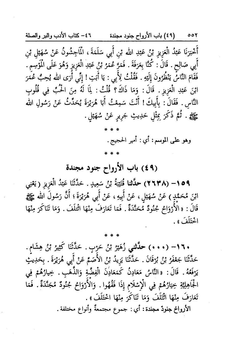 [2637] إِن الله إِذا أحب عبدا دَعَا جِبْرِيل الحَدِيث قَالَ الْعلمَاء محبَّة الله لعَبْدِهِ هِيَ إِرَادَته الْخَيْر لَهُ وهدايته وإنعامه عَلَيْهِ وَرَحمته وبغضه إِرَادَته عِقَابه وشقاوته وَنَحْوه وَحب جِبْرِيل وملائكة يحْتَمل وَجْهَيْن أَحدهمَا استغفارهم لَهُ وثناؤهم عَلَيْهِ ودعاؤهم وَالثَّانِي انه على ظَاهره الْمَعْرُوف من الْخلق وَهُوَ ميل الْقلب إِلَيْهِ واشتياقه إِلَى لِقَائِه وَسبب ذَلِك كَونه مُطيعًا لله محبوبا لَهُ وَمعنى يوضع لَهُ الْقبُول فِي الأَرْض الْحبّ فِي قُلُوب النَّاس ورضاهم عَنهُ وَهُوَ على الْمَوْسِم أَي أَمِير الحجيج