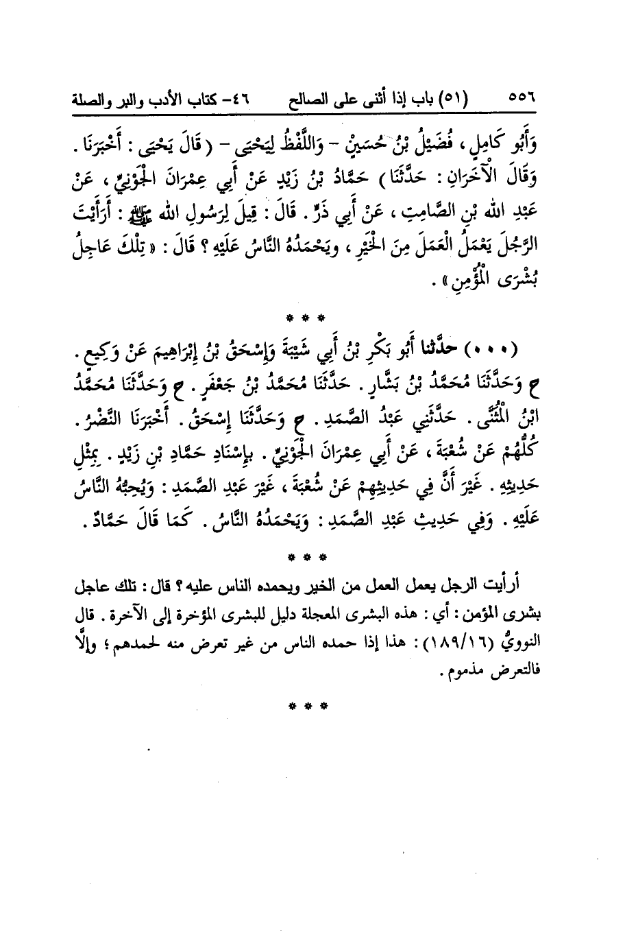 [2642] أَرَأَيْت الرجل يعْمل الْعَمَل من الْخَيْر وَيَحْمَدهُ النَّاس عَلَيْهِ قَالَ تِلْكَ عَاجل بشرى الْمُؤمن أَي هَذِه الْبُشْرَى المعجلة دَلِيل للبشرى المؤخرة إِلَى الْآخِرَة قَالَ النَّوَوِيّ هَذَا إِذا حَمده النَّاس من غير تعرض مِنْهُ لحمدهم وَإِلَّا فالتعرض مَذْمُوم