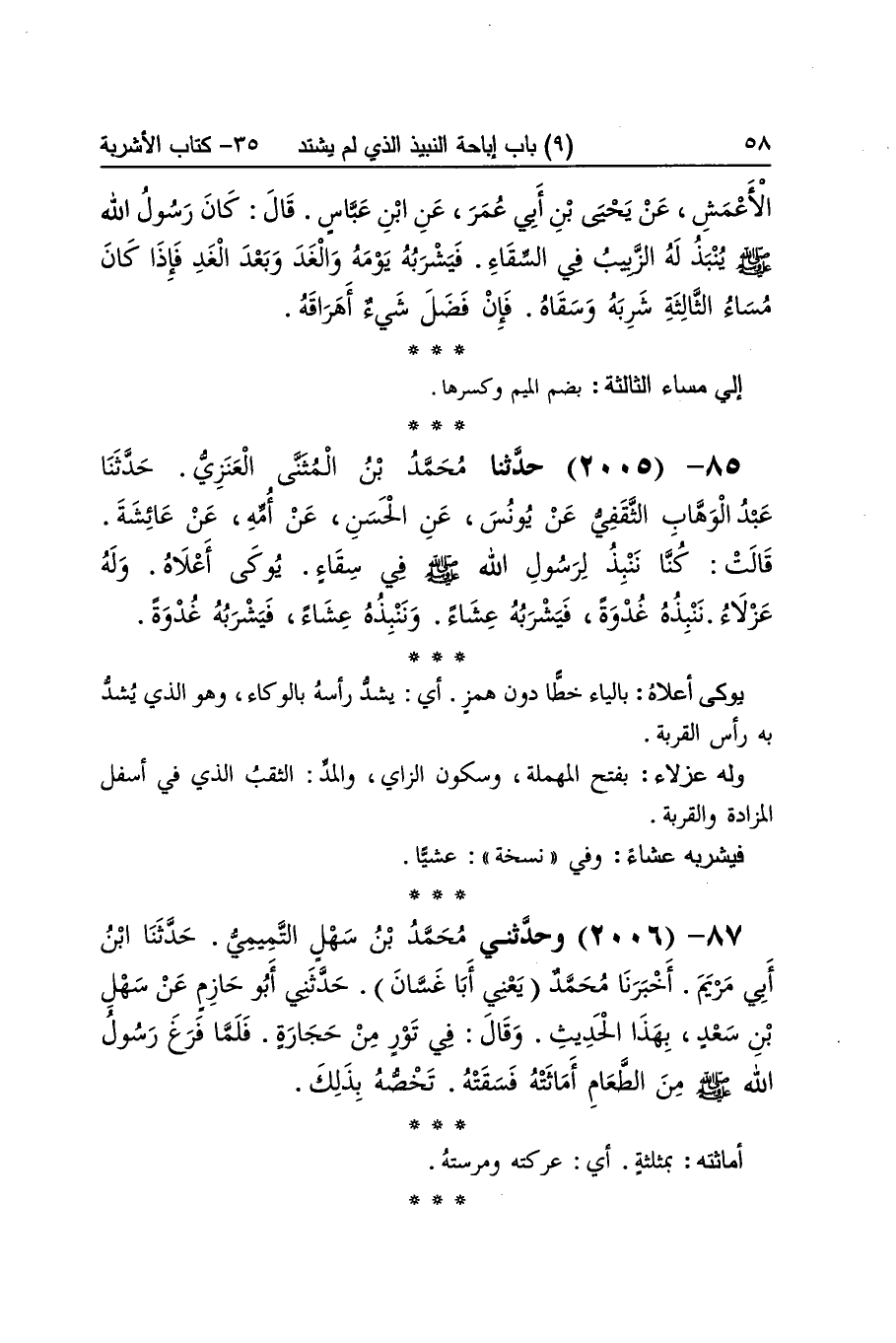 [2005] يوكى أَعْلَاهُ بِالْيَاءِ خطا دون همز أَي يشد رَأسه بالوكاء وَهُوَ الَّذِي يشد بِهِ رَأس الْقرْبَة وَله عزلاء بِفَتْح الْمُهْملَة وَسُكُون الزَّاي وَالْمدّ الثقب الَّذِي فِي أَسْفَل المزادة والقربة فيشربه عشَاء وَفِي نُسْخَة عشيا