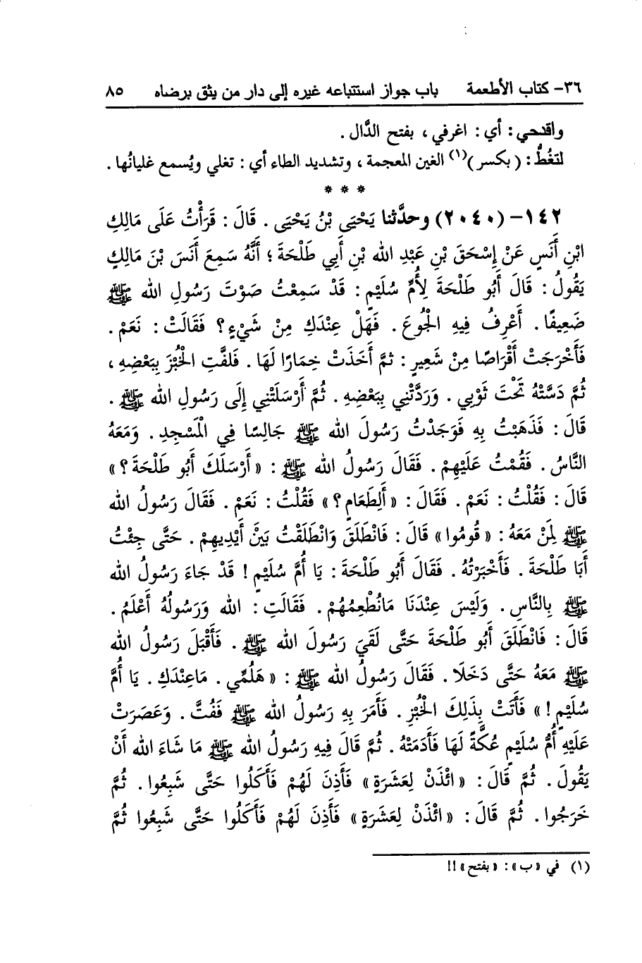 [2039] خمصا بِفَتْح الْخَاء وَالْمِيم أَي ضامر الْبَطن من الْجُوع فَانْكَفَأت فِي نُسْخَة فانكفيت وَالصَّوَاب الأول وَلنَا بَهِيمَة بِضَم الْبَاء تَصْغِير بهمة وَهِي الصَّغِير من أَوْلَاد الضَّأْن سورا بِضَم السِّين وَسُكُون الْوَاو بِغَيْر همز الطَّعَام الَّذِي يدعى إِلَيْهِ وَقيل الطَّعَام مُطلقًا وَهِي لَفْظَة فارسية قَالَ النَّوَوِيّ وَقد تظاهرت أَحَادِيث صَحِيحَة بِأَن النَّبِي صلى الله عَلَيْهِ وَسلم تكلم بِأَلْفَاظ غير الْعَرَبيَّة فَيدل على جَوَازه فحي هلا بكم بتنوين هلا وَقيل بِلَا تَنْوِين أَي عَلَيْكُم بِهِ عمد بِفَتْح الْمِيم فبسق فِي نُسْخَة فبصق ادّعى خابزة فِي نُسْخَة ادْعُونِي أَي اطْلُبُوا لي وَفِي نُسْخَة ادعني أَي اطلب لي واقدحي أَي اغرفي بِفَتْح الدَّال لتغط بِكَسْر الْغَيْن الْمُعْجَمَة وَتَشْديد الطَّاء أَي تغلي وَيسمع غليانها