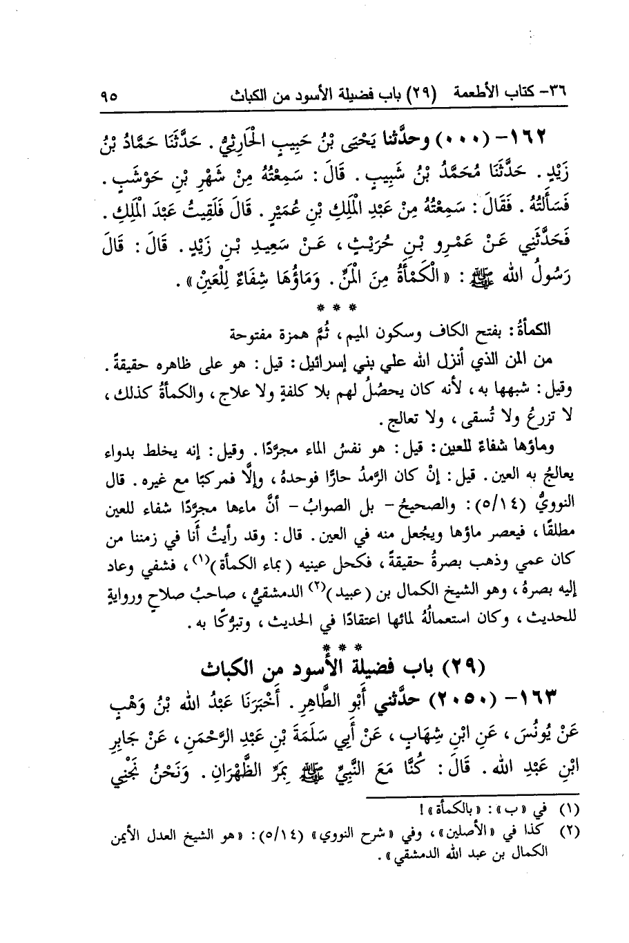 [2049] الكمأة بِفَتْح الْكَاف وَسُكُون الْمِيم ثمَّ همزَة مَفْتُوحَة من الْمَنّ الَّذِي أنزل الله على بني إِسْرَائِيل قيل هُوَ على ظَاهره حَقِيقَة وَقيل شبهها بِهِ لِأَنَّهُ كَانَ يحصل لَهُم بِلَا كلفة وَلَا علاج والكمأة كَذَلِك لَا تزرع وَلَا تسقى وَلَا تعالج وماوها شِفَاء للعين قيل هُوَ نفس المَاء مُجَردا وَقيل إِنَّه يخلط بدواء يعالج بِهِ الْعين قيل إِن كَانَ الرمد حارا فوحده وَإِلَّا فمركبا مَعَ غَيره قَالَ النَّوَوِيّ وَالصَّحِيح بل الصَّوَاب أَن ماءها مُجَردا شِفَاء للعين مُطلقًا فيعصر مَاؤُهَا وَيجْعَل مِنْهُ فِي الْعين قَالَ وَقد رَأَيْت أَنا فِي زمننا من كَانَ عمي وَذهب بَصَره حَقِيقَة فكحل عَيْنَيْهِ بِمَاء الكمأة فشفي وَعَاد إِلَيْهِ بَصَره وَهُوَ الشَّيْخ الْكَمَال بن عبيد الدِّمَشْقِي صَاحب صَلَاح وَرِوَايَة للْحَدِيث وَكَانَ اسْتِعْمَاله لمائها اعتقادا فِي الحَدِيث وتبركا بِهِ