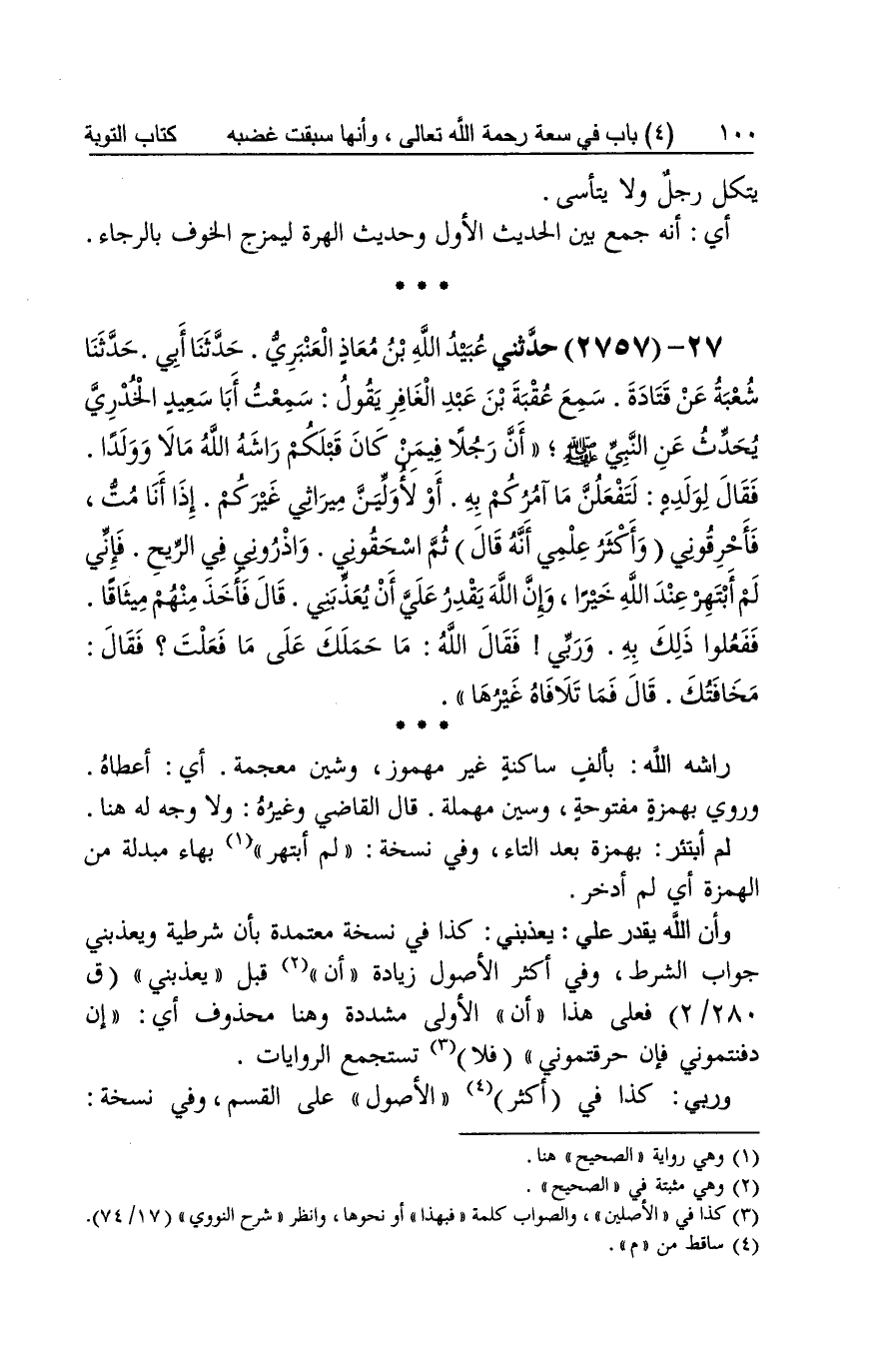 [2756] لَئِن قدر الله عَلَيْهِ قَالَ النَّوَوِيّ هُوَ بِالتَّخْفِيفِ بِمَعْنى قدر بِالتَّشْدِيدِ أَي قضى أَو هُوَ بِمَعْنى ضيق وَلَيْسَ شكا فِي الْقُدْرَة وَقيل قَالَه فِي حَالَة غلب عَلَيْهِ فِيهَا الدهش وَالْخَوْف وَشدَّة الوجع فَلم يضْبط مَا يَقُوله فَصَارَ فِي معنى الغافل وَهَذِه الْحَالة لَا يُؤَاخذ فِيهَا وَقيل كَانَ فِي زمن فَتْرَة حِين ينفع مُجَرّد التَّوْحِيد وَلَا تَكْلِيف قبل وُرُود الشَّرْع على الصَّحِيح لقَوْله تَعَالَى وَمَا كُنَّا معذبين حَتَّى نبعث رَسُولا أسرف رجل على نَفسه أَي بَالغ فِي الْمعاصِي قَالَ الزُّهْرِيّ ذَلِك لِئَلَّا يتكل رجل وَلَا يتأسى أَي أَنه جمع بَين الحَدِيث الأول وَحَدِيث الْهِرَّة ليمزج الْخَوْف بالرجاء