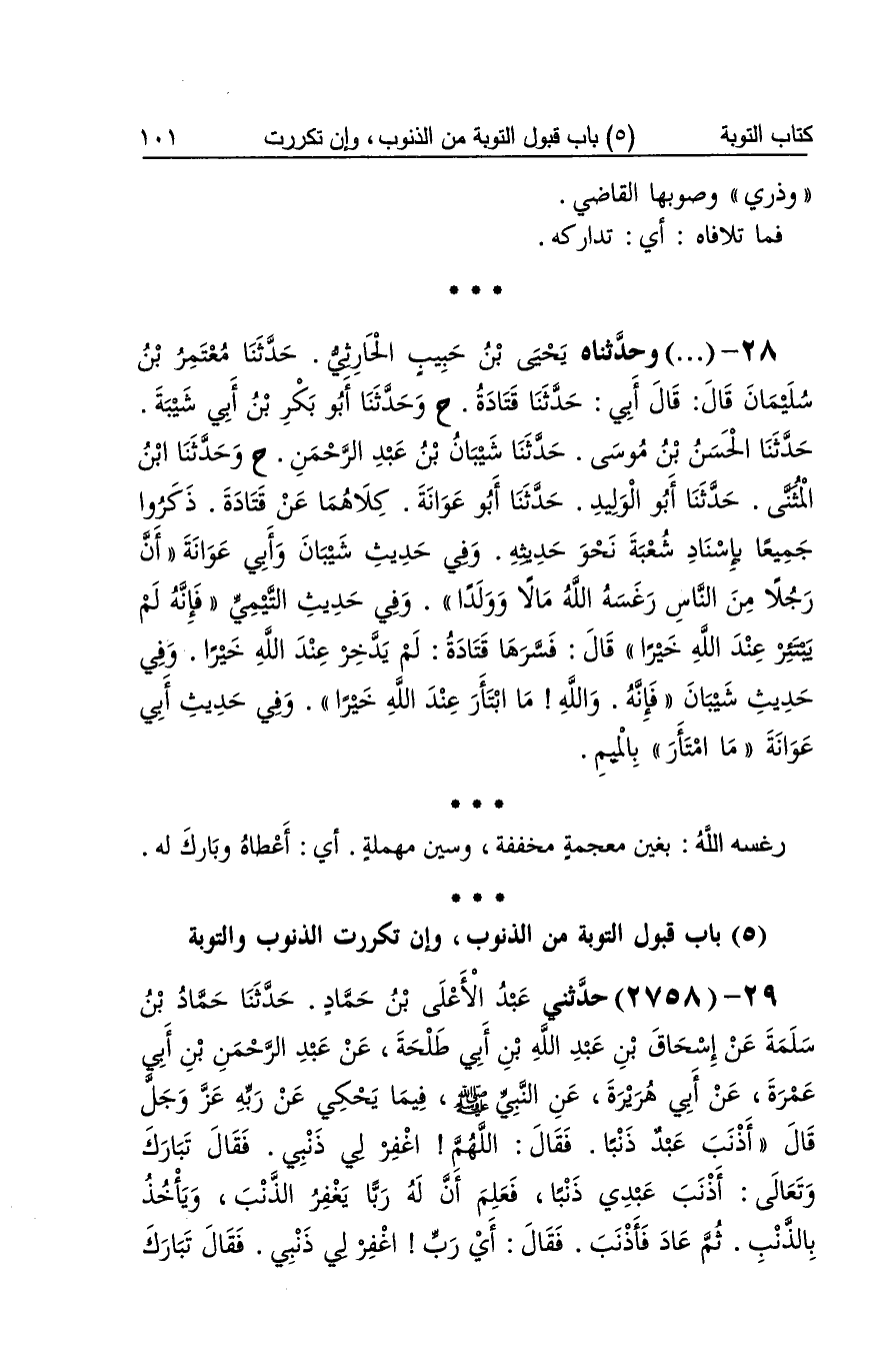 [2757] راشه الله بِأَلف سَاكِنة غير مَهْمُوز وشين مُعْجمَة أَي أعطَاهُ وَرُوِيَ بِهَمْزَة مَفْتُوحَة وسين مُهْملَة قَالَ القَاضِي وَغَيره وَلَا وَجه لَهُ هُنَا لم أبتئر بِهَمْزَة بعد التَّاء وَفِي نسخةلم أبتهر بهاء مبدلة من الْهمزَة أَي لم أدخر وَأَن الله يقدر عَليّ يُعَذِّبنِي كَذَا فِي نُسْخَة مُعْتَمدَة بِأَن شَرْطِيَّة ويعذبني جَوَاب الشَّرْط وَفِي أَكثر الْأُصُول زِيَادَة أَن قبل يُعَذِّبنِي فعلى هَذَا أَن الأولى مُشَدّدَة وَهنا مَحْذُوف أَي إِن دفنتموني فَإِن حرقتموني فَلَا تستجمع الرِّوَايَات وربي كَذَا فِي أَكثر الْأُصُول على الْقسم وَفِي نُسْخَة وذري وصوبها القَاضِي فَمَا تلافاه أَي تَدَارُكه رغسه الله بغين مُعْجمَة مُخَفّفَة وسين مُهْملَة أَي أعطَاهُ وَبَارك لَهُ
