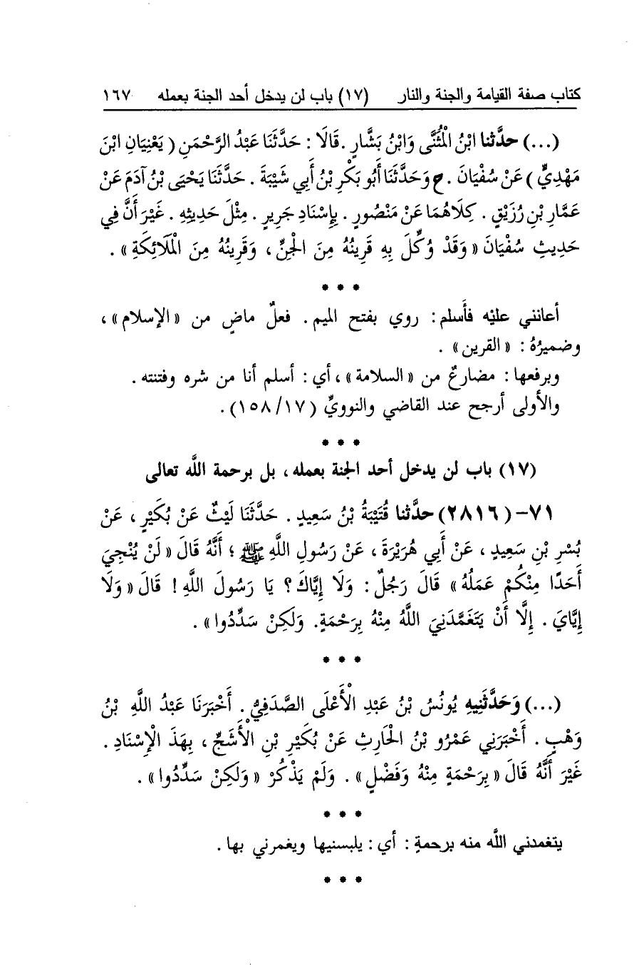 [2814] أعانني عَلَيْهِ فَأسلم رُوِيَ بِفَتْح الْمِيم فعل مَاض من الْإِسْلَام وضميره القرين وبرفعها مضارع من السَّلامَة أَي أسلم أَنا من شَره وفتنته وَالْأولَى أرجح عِنْد القَاضِي وَالنَّوَوِيّ