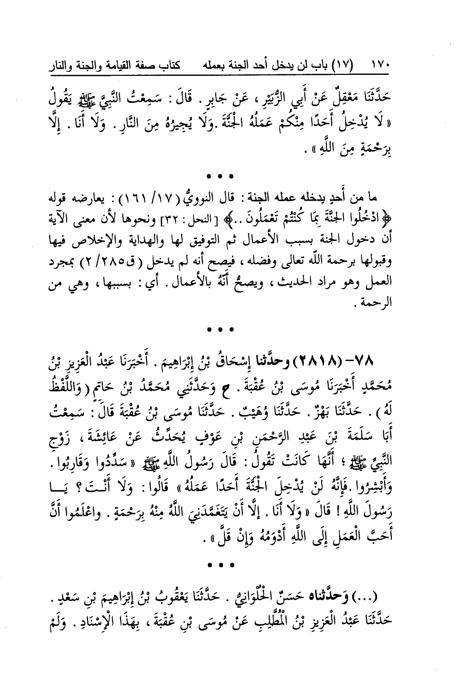 [2817] مَا من أحد يدْخلهُ عمله الْجنَّة قَالَ النَّوَوِيّ يُعَارضهُ قَوْله ادخُلُوا الْجنَّة بِمَا كُنْتُم تَعْمَلُونَ وَنَحْوهَا لِأَن معنى الْآيَة أَن دُخُول الْجنَّة بِسَبَب الْأَعْمَال ثمَّ التَّوْفِيق لَهَا وَالْهِدَايَة وَالْإِخْلَاص فِيهَا وقبولها برحمة الله تَعَالَى وفضله فَيصح أَنه لم يدْخل بِمُجَرَّد الْعَمَل وَهُوَ مُرَاد الحَدِيث وَيصِح أَنه بِالْأَعْمَالِ أَي بِسَبَبِهَا وَهِي من الرَّحْمَة