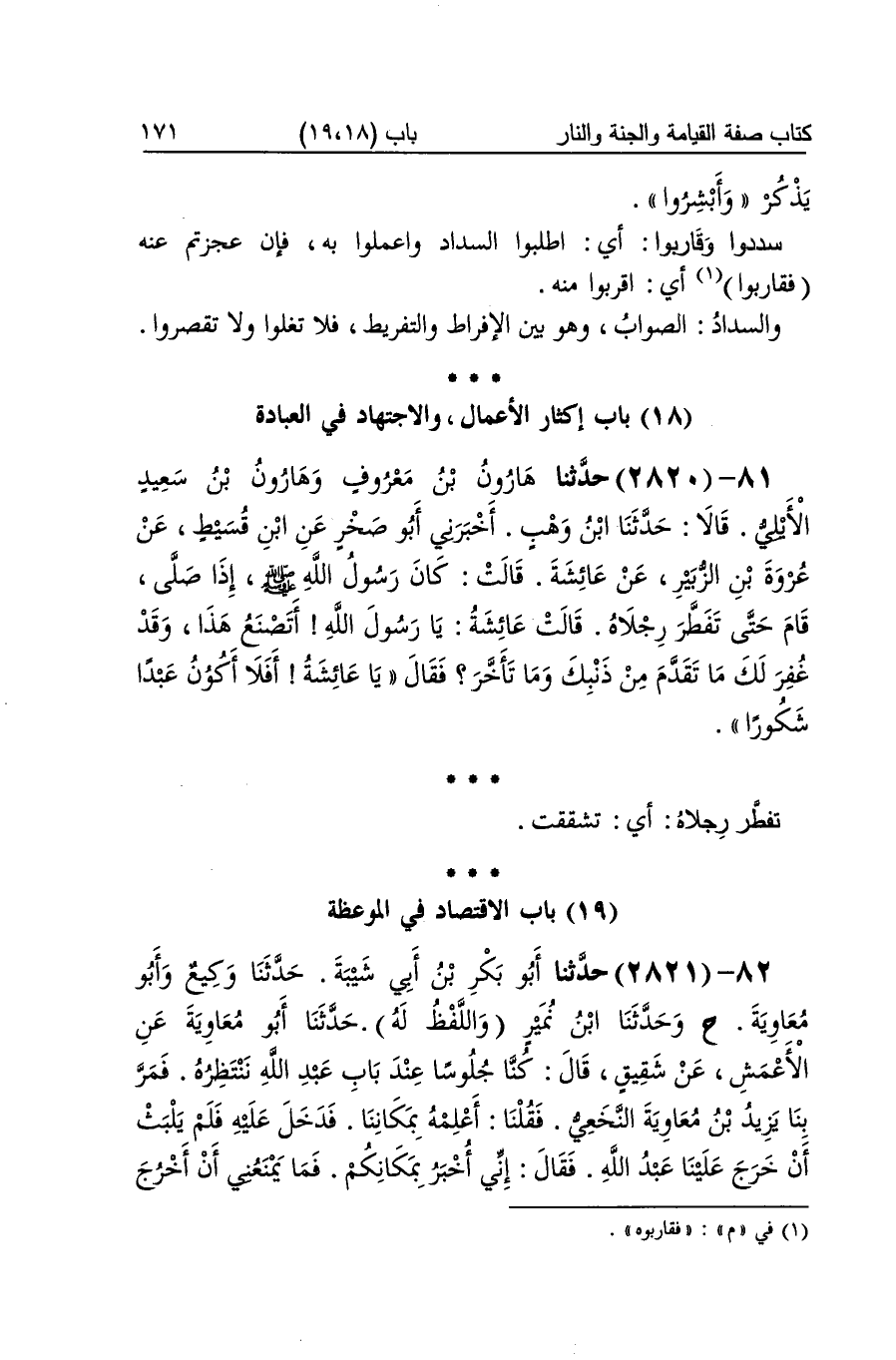 [2818] سددوا وقاربوا أَي اطْلُبُوا السداد وَاعْمَلُوا بِهِ فَإِن عجزتم عَنهُ فقاربوا أَي اقربوا مِنْهُ والسداد الصَّوَاب وَهُوَ بَين الإفراط والتفريط فَلَا تغلوا وَلَا تقصرُوا