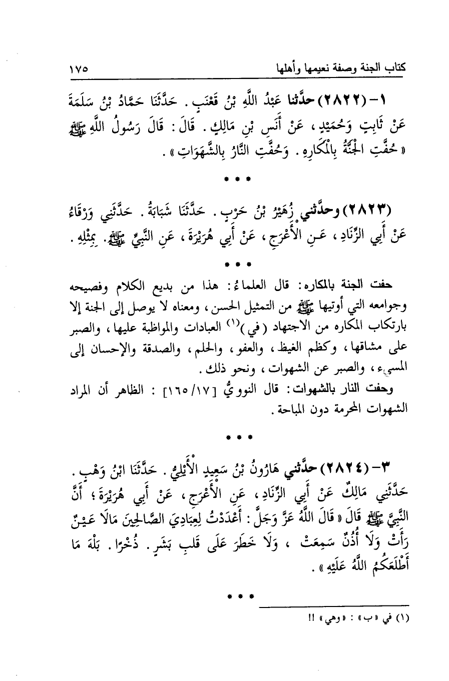 [2823] حفت الْجنَّة بالمكاره قَالَ الْعلمَاء هَذَا من بديع الْكَلَام وفصيحه وجوامعه الَّتِي أوتيها صلى الله عَلَيْهِ وَسلم من التَّمْثِيل الْحسن وَمَعْنَاهُ لَا يُوصل إِلَى الْجنَّة إِلَّا بارتكاب المكاره من الِاجْتِهَاد فِي الْعِبَادَات والمواظبة عَلَيْهَا وَالصَّبْر على مشاقها وكظم الغيظ وَالْعَفو والحلم وَالصَّدَََقَة وَالْإِحْسَان إِلَى الْمُسِيء وَالصَّبْر عَن الشَّهَوَات وَنَحْو ذَلِك وحفت النَّار بالشهوات قَالَ النَّوَوِيّ الظَّاهِر أَن المُرَاد الشَّهَوَات الْمُحرمَة دون الْمُبَاحَة