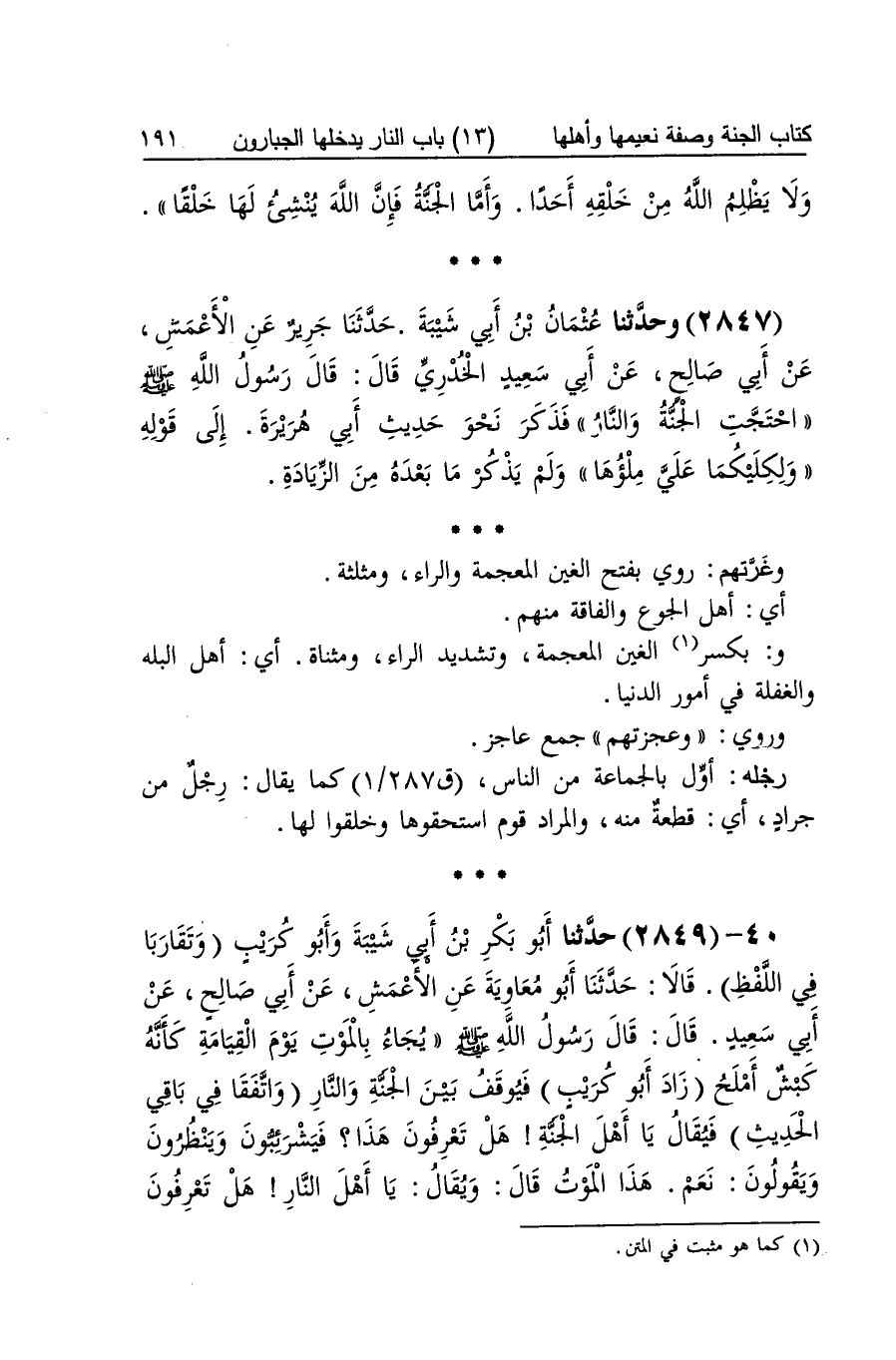 [2846] احتجت النَّار وَالْجنَّة قَالَ النَّوَوِيّ هَذَا على ظَاهره وَأَن الله جعل فيهمَا تمييزا يدركان بِهِ وَلَا يلْزم دَوَامه وَسَقَطهمْ بِفَتْح السِّين وَالْقَاف أَي ضُعَفَاؤُهُمْ والمحتقرون مِنْهُم وعجزهم بِفَتْح الْعين وَالْجِيم جمع عَاجز أَي العاجزون عَن طلب الدُّنْيَا والتمكن فِيهَا والثروة والشوكة فَيَضَع قدمه هُوَ من أَحَادِيث الصِّفَات الَّتِي تفوض أَو تَأَول على أَن المُرَاد بالقدم من قدمه لَهَا من أهل الْعَذَاب أَو مخلوقا يُسمى بذلك قطّ قطّ بِسُكُون الطَّاء وبكسرها منونا وَغير منون أَي حسبي