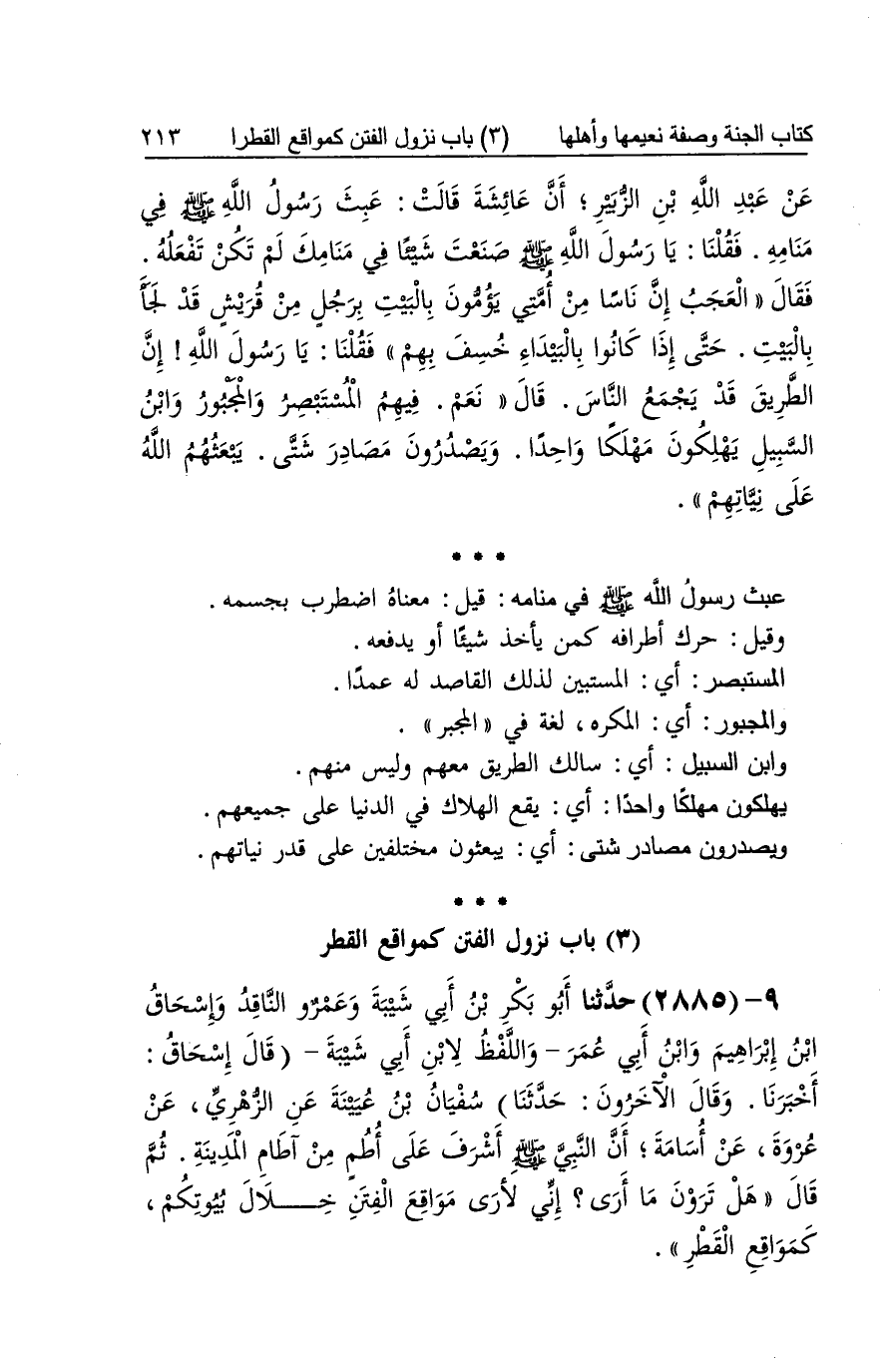 [2884] عَبث رَسُول الله صلى الله عَلَيْهِ وَسلم فِي مَنَامه قيل مَعْنَاهُ اضْطربَ بجسمه وَقيل حرك أَطْرَافه كمن يَأْخُذ شَيْئا أَو يَدْفَعهُ المستبصر أَي المستبين لذَلِك القاصد لَهُ عمدا وَالْمَجْبُور أَي الْمُكْره لُغَة فِي الْمُجبر وَابْن السَّبِيل أَي سالك الطَّرِيق مَعَهم وَلَيْسَ مِنْهُم يهْلكُونَ مهْلكا وَاحِدًا أَي يَقع الْهَلَاك فِي الدُّنْيَا على جَمِيعهم وَيَصْدُرُونَ مصَادر شَتَّى أَي يبعثون مُخْتَلفين على قدر نياتهم