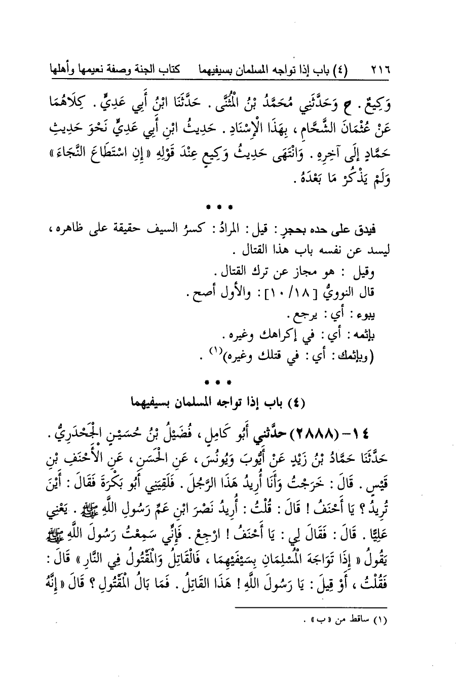 [2887] فَيدق على حَده بِحجر قيل المُرَاد كسر السَّيْف حَقِيقَة على ظَاهره ليسد عَن نَفسه بَاب هَذَا الْقِتَال وَقيل هُوَ مجَاز عَن ترك الْقِتَال قَالَ النَّوَوِيّ وَالْأول أصح يبوء أَي يرجع بإثمه أَي فِي إكراهك وَغَيره وبإثمك أَي فِي قَتلك وَغَيره