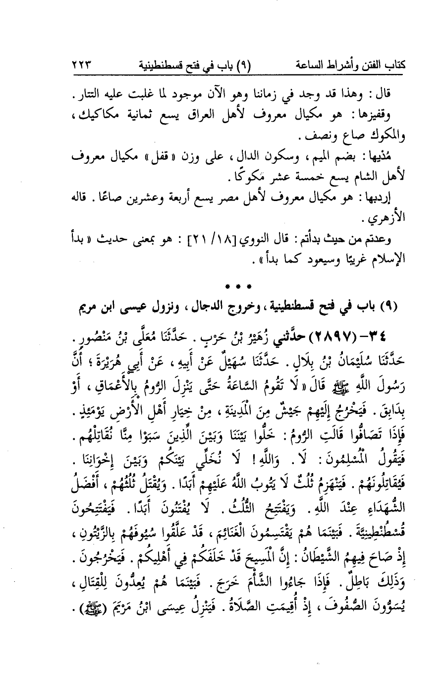 [2896] منعت الْعرَاق درهمها قَالَ النَّوَوِيّ مَعْنَاهُ أَن الْعَجم وَالروم يستولون على الْبِلَاد فِي آخر الزَّمَان فيمنعون حُصُول ذَلِك للْمُسلمين قَالَ وَهَذَا قد وجد فِي زَمَاننَا وَهُوَ الْآن مَوْجُود لما غلبت عَلَيْهِ التتار وقفيزها هُوَ مكيال مَعْرُوف لأهل الْعرَاق يسع ثَمَانِيَة مكاكيك والمكوك صَاع وَنصف مديها بِضَم الْمِيم وَسُكُون الدَّال على وزمن قفل مكيال مَعْرُوف لأهل الشَّام يسع خَمْسَة عشر مكوكا إردبها هُوَ مكيال مَعْرُوف لأهل مصر يسع أَرْبَعَة وَعشْرين صَاعا قَالَه الْأَزْهَرِي وعدتم من حَيْثُ بدأتم قَالَ النَّوَوِيّ هُوَ بِمَعْنى حَدِيث بَدَأَ الْإِسْلَام غَرِيبا وَسَيَعُودُ كَمَا بَدَأَ