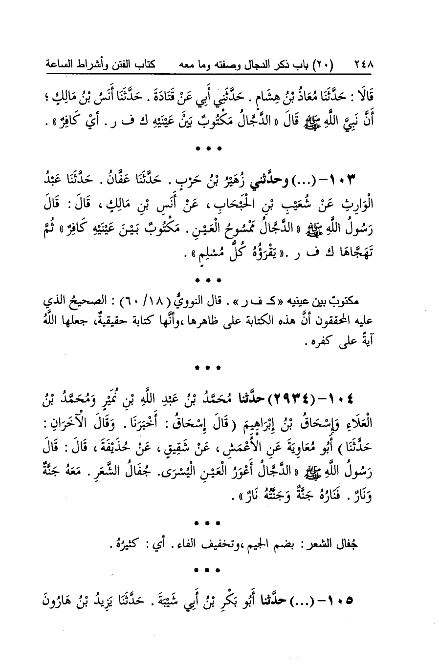 [2933] مَكْتُوب بَين عَيْنَيْهِ ك ف ر قَالَ النَّوَوِيّ الصَّحِيح الَّذِي عَلَيْهِ الْمُحَقِّقُونَ أَن هَذِه الْكِتَابَة على ظَاهرهَا وَأَنَّهَا كِتَابَة حَقِيقِيَّة جعلهَا الله آيَة علىكفره