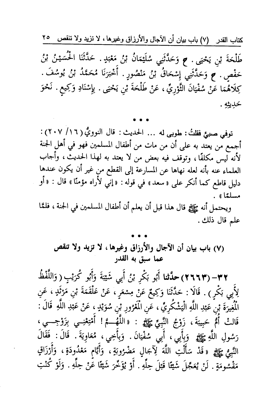 [2662] توفّي صبي فَقلت طُوبَى لَهُ الحَدِيث قَالَ النَّوَوِيّ أجمع من يعْتد بِهِ على أَن من مَاتَ من أَطْفَال الْمُسلمين فَهُوَ فِي أهل الْجنَّة لِأَنَّهُ لَيْسَ مُكَلّفا وَتوقف فِيهِ بعض من لَا يعْتد بِهِ لهَذَا الحَدِيث وَأجَاب الْعلمَاء عَنهُ بِأَنَّهُ لَعَلَّه نهاها عَن المسارعة إِلَى الْقطع من غير أَن يكون عِنْدهَا دَلِيل قَاطع كَمَا أنكر على سعد فِي قَوْله إِنِّي لأراه مُؤمنا قَالَ أَو مُسلما وَيحْتَمل أَنه صلى الله عَلَيْهِ وَسلم قَالَ هَذَا قبل أَن يعلم أَن أَطْفَال الْمُسلمين فِي الْجنَّة فَلَمَّا علم قَالَ ذَلِك