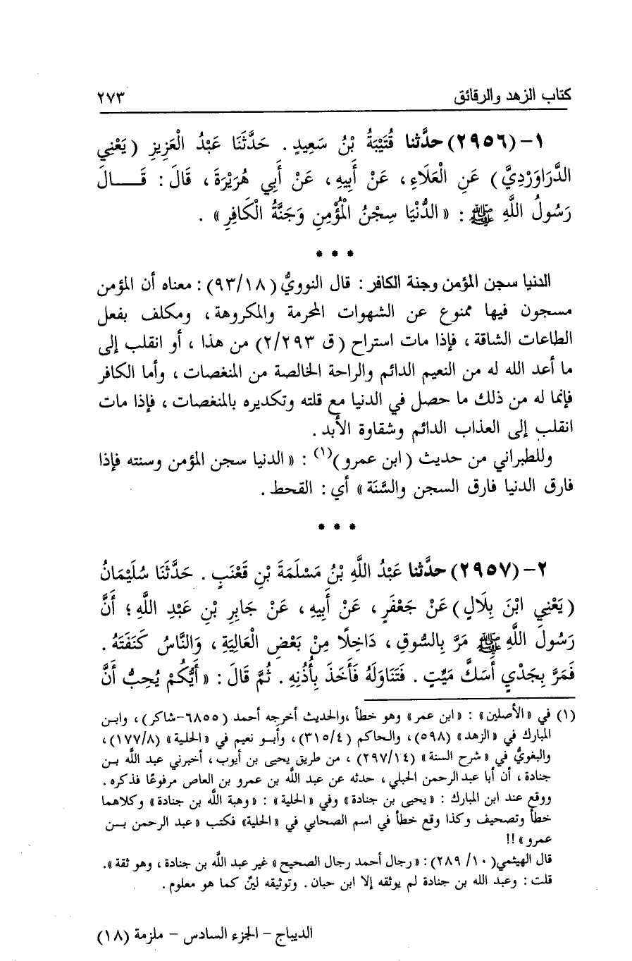 [2956] الدُّنْيَا سجن الْمُؤمن وجنة الْكَافِر قَالَ النَّوَوِيّ مَعْنَاهُ أَن الْمُؤمن مسجون فِيهَا مَمْنُوع عَن الشَّهَوَات الْمُحرمَة والمكروهة ومكلف بِفعل الطَّاعَات الشاقة فَإِذا مَاتَ استراح من هَذَا أَو انْقَلب إِلَى مَا أعد الله لَهُ من النَّعيم الدَّائِم والراحة الْخَالِصَة من المنغصات وَأما الْكَافِر فَإِنَّمَا لَهُ من ذَلِك مَا حصل فِي الدُّنْيَا مَعَ قلته وتكديره بالمنغصات فَإِذا مَاتَ انْقَلب إِلَى الْعَذَاب الدَّائِم وشقاوة الْأَبَد وللطبراني من حَدِيث بن عَمْرو الدُّنْيَا سجن الْمُؤمن وسنته فَإِذا فَارق الدُّنْيَا فَارق السجْن وَالسّنة أَي الْقَحْط
