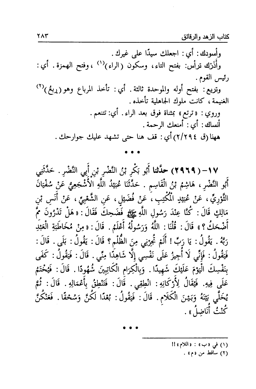 [2968] أَي فل بِضَم الْفَاء وَسُكُون اللَّام وَمَعْنَاهُ يَا فلَان وأسودك أَي اجعلك سيدا على غَيْرك وأذرك ترأس بِفَتْح التَّاء وَسُكُون الرَّاء وَفتح الْهمزَة أَي رَئِيس الْقَوْم وتربع بِفَتْح أَوله وَالْمُوَحَّدَة ثَالِثَة أَي تَأْخُذ المرباع وَهُوَ ربع الْغَنِيمَة كَانَت مُلُوك الْجَاهِلِيَّة تَأْخُذهُ وَرُوِيَ ترتع بمثناة فَوق بعد الرَّاء أَي تتنعم أنساك أَي أمنعك الرَّحْمَة هَهُنَا أَي قف هُنَا حَتَّى تشهد عَلَيْك جوارحك