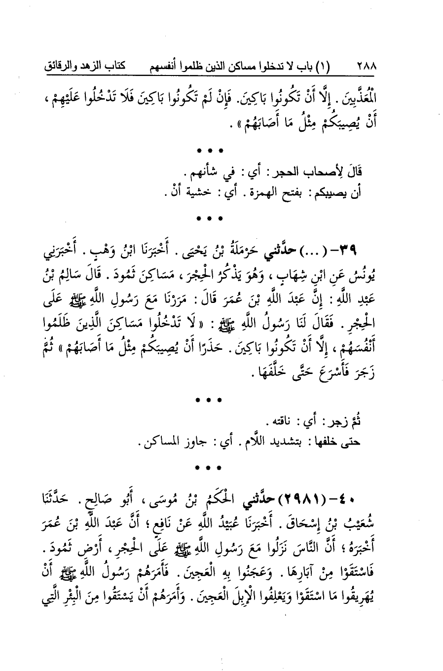 [2980] قَالَ لأَصْحَاب الْحجر أَي فِي شَأْنهمْ أَن يُصِيبكُم بِفَتْح الْهمزَة أَي خشيَة أَن ثمَّ زجر أَي نَاقَته حَتَّى خلفهَا بتَشْديد اللَّام أَي جَاوز المساكن