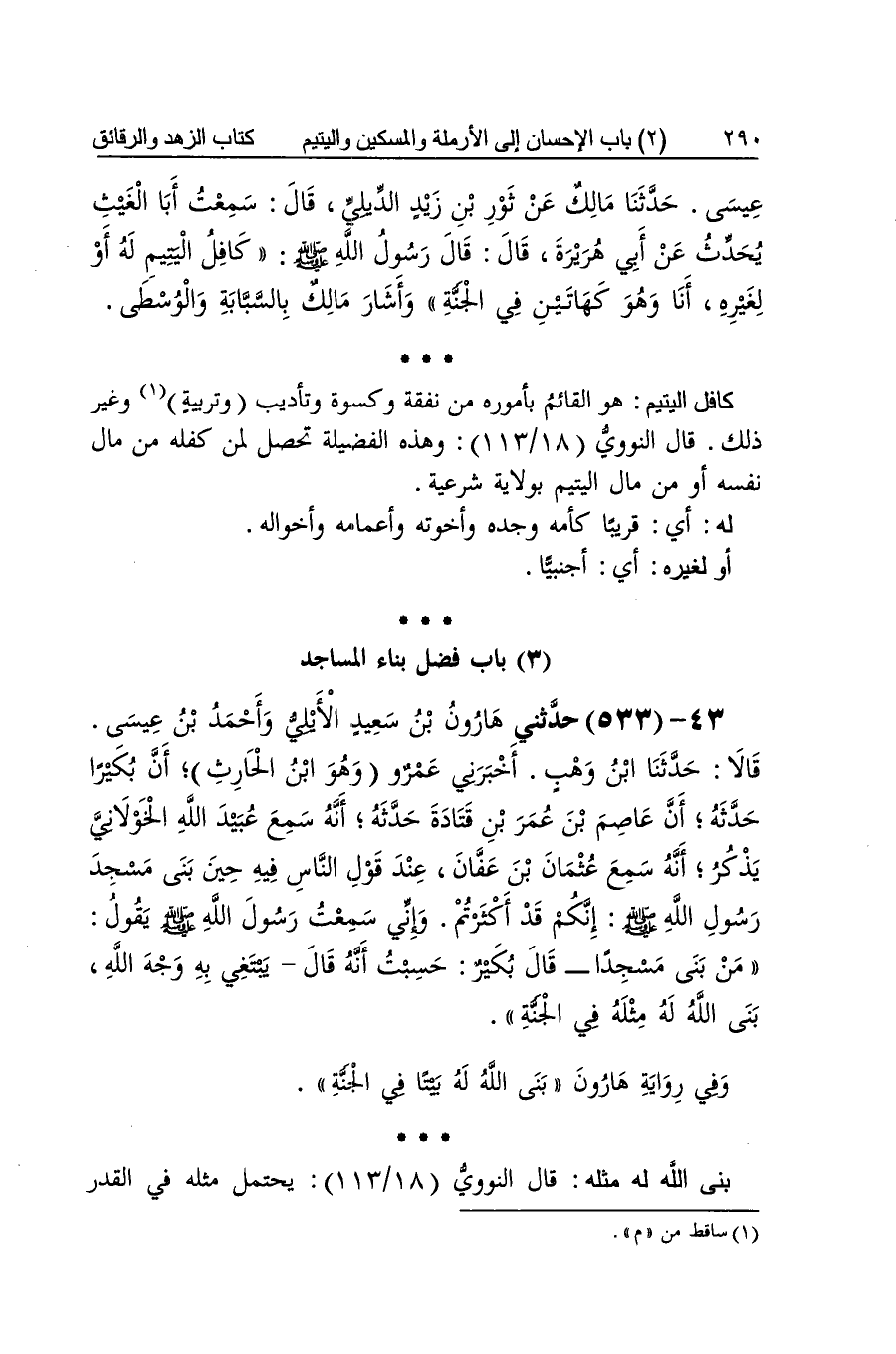 [2983] كافل الْيَتِيم هُوَ الْقَائِم بأموره من نَفَقَة وَكِسْوَة وتأديب وتربية وَغير ذَلِك قَالَ النَّوَوِيّ وَهَذِه الْفَضِيلَة تحصل لمن كفله من مَال نَفسه أَو من مَال الْيَتِيم بِولَايَة شَرْعِيَّة لَهُ أَي قَرِيبا كَأُمِّهِ وجده وأخوته وأعمامه وأخواله أَو لغيره أَي أَجْنَبِيّا