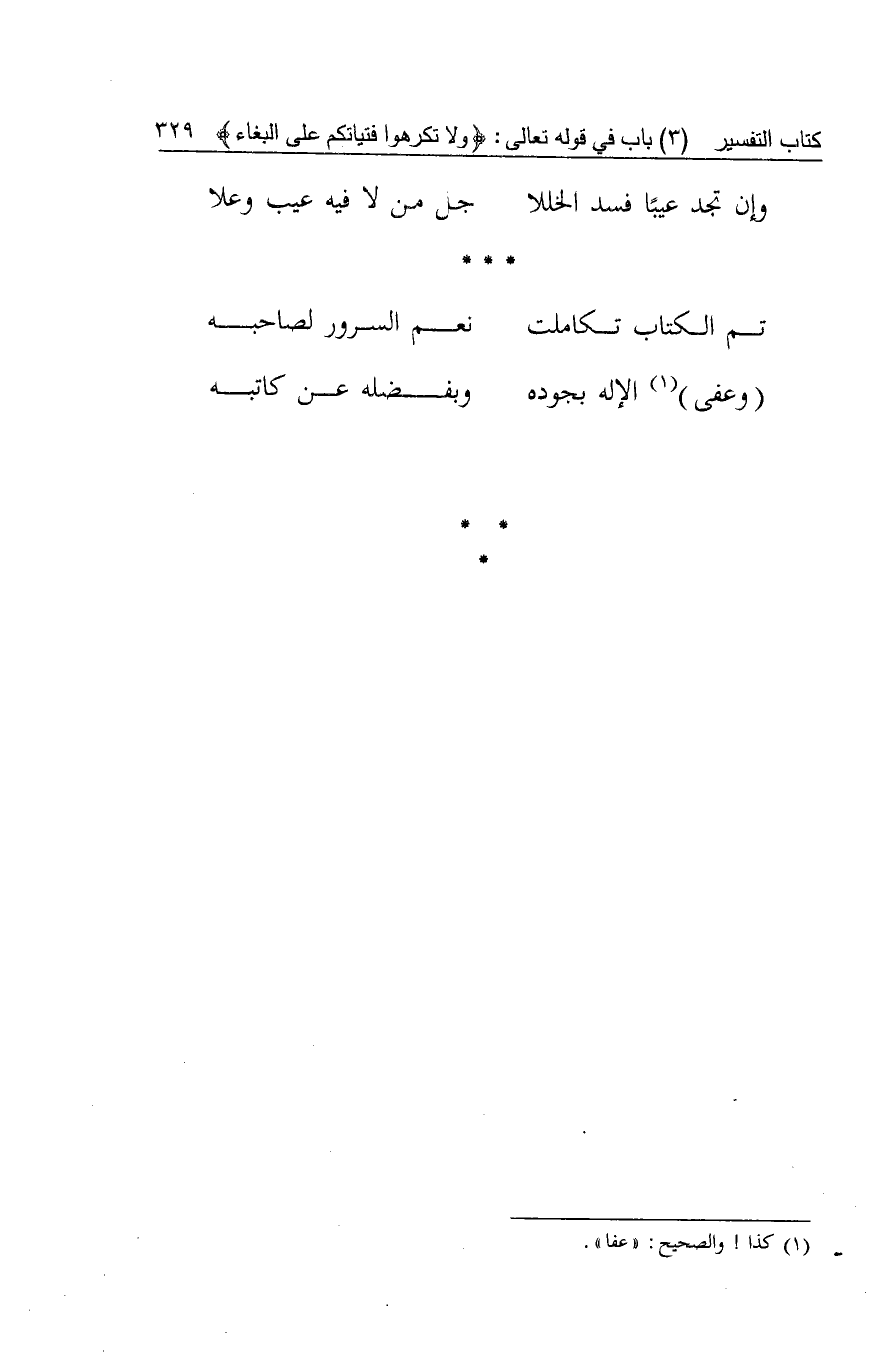 [3028] تطوافا بِكَسْر الْمُثَنَّاة فَوق وَهُوَ ثوب تلبسه الْمَرْأَة تَطوف بِهِ مُسَيْكَة بِضَم الْمِيم من بعد إكراههن لَهُنَّ غَفُور رَحِيم قَالَه النَّوَوِيّ كَذَا وَقع فِي كل الْأُصُول وَلم يرد أَن لَفْظَة لَهُنَّ منزلَة فَإِنَّهُ لم يقْرَأ بهَا أحد وَإِنَّمَا هُوَ تَفْسِير وَبَيَان أَن الْمَغْفِرَة لَهُنَّ لكونهن مكرهات لَا لمن أكرههن قلت بل هِيَ منزلَة وَكَانَت قُرْآنًا ثمَّ نسخ رسمها نَص على ذَلِك أَبُو عبيد وَقَول الشَّيْخ لم يقْرَأ بهَا أحد مَمْنُوع فقد أخرج هَذَا الحَدِيث سعيد بن مَنْصُور فِي سنَنه وَأَبُو عبيد فِي فضائله وَابْن الْمُنْذر وَابْن أبي حَاتِم فِي تفسيرهما وَزَادُوا آخِره هَكَذَا كَانَ يقْرَأ وَأخرج بن أبي حَاتِم عَن سعيد بن جُبَير قَالَ فِي قِرَاءَة بن مَسْعُود فَإِن الله من بعد إكراههن لَهُنَّ غَفُور رَحِيم قَالَ بن جني فِي الْمُحْتَسب قِرَاءَة بن عَبَّاس وَسَعِيد بن جُبَير من بعد إكراههن لَهُنَّ غَفُور رَحِيم وَاللَّام فِي لَهُنَّ مُتَعَلقَة بغفور لِأَنَّهُ أدنى إِلَيْهَا وَيجوز تعلقهَا برحيم وَالله تَعَالَى أعلم وَجَاء فِي آخر النُّسْخَة ب آخر الديباج وَالْحَمْد لله وَحده وَصلى الله على سيدنَا مُحَمَّد وَآله وَصَحبه وَسلم وَكَانَ الْفَرَاغ من تَعْلِيقه فِي يَوْم الثُّلَاثَاء الْمُبَارك سَابِع شهر الله الْمحرم الْحَرَام سنة اثْنَي عشرَة وَألف وَالْحَمْد لله على كل حَال وَجَاء فِي آخر النُّسْخَة م نجز الْكتاب بِحَمْد الله وعونه وَحسن توفيقه فِي يَوْم الْأَرْبَعَاء الْمُبَارك تَاسِع محرم الْحَرَام سنة على يَد أفقر الْعباد إِلَى ربه الْغَنِيّ الْجواد أَحْمد بن مُحَمَّد النجاحي غفر الله لَهُ ولوالديه ولكافة الْمُسلمين أَجْمَعِينَ وَصلى الله على سيدنَا مُحَمَّد وعَلى آله وَصَحبه وَسلم تَسْلِيمًا كثيرا وَإِن تَجِد عَيْبا فسد الخللا جلّ من لَا فِيهِ عيب وَعلا تمّ الْكتاب تكاملت نعم السرُور لصَاحبه وَعفى الْإِلَه بجوده وبفضله عَن كَاتبه