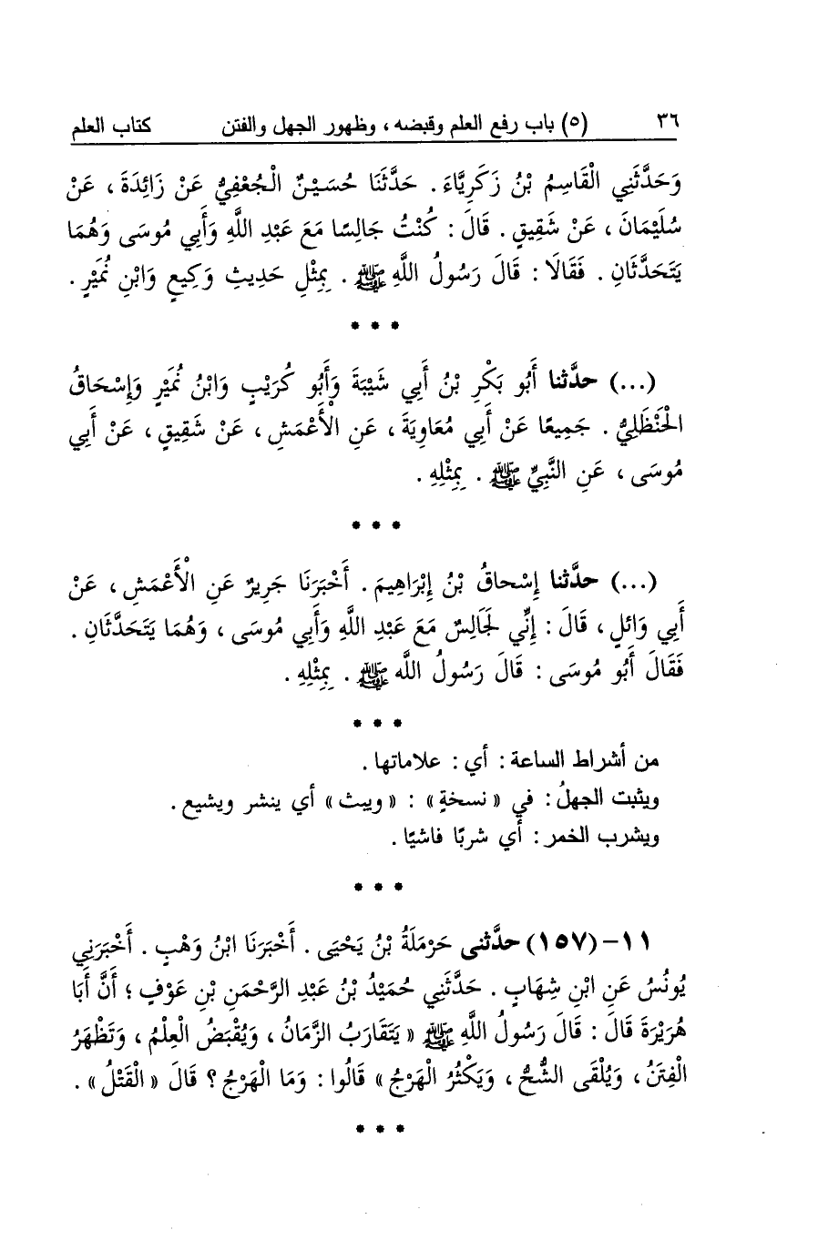 [2672] من أَشْرَاط السَّاعَة أَي علاماتها وَيثبت الْجَهْل فِي نُسْخَة ويبث أَي ينشر ويشيع وَيشْرب الْخمر أَي شربا فاشيا