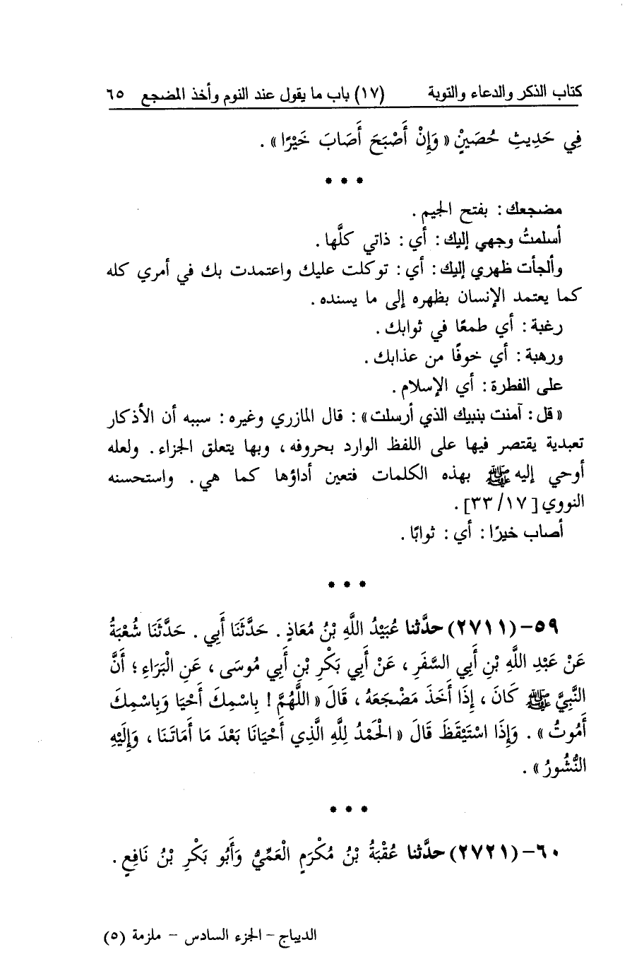 [2710] مضجعك بِفَتْح الْجِيم أسلمت وَجْهي إِلَيْك أَي ذاتي كلهَا وألجأت ظَهْري إِلَيْك أَي توكلت عَلَيْك واعتمدت بك فِي أَمْرِي كُله كَمَا يعْتَمد الْإِنْسَان بظهره إِلَى مَا يسْندهُ رَغْبَة أَي طَمَعا فِي ثوابك وَرَهْبَة أَي خوفًا من عذابك على الْفطْرَة أَي الْإِسْلَام قل آمَنت بنبيك الَّذِي أرْسلت قَالَ الْمَازرِيّ وَغَيره سَببه أَن الْأَذْكَار تعبدية يقْتَصر فِيهَا على اللَّفْظ الْوَارِد بِحُرُوفِهِ وَبهَا يتَعَلَّق الْجَزَاء وَلَعَلَّه أُوحِي إِلَيْهِ صلى الله عَلَيْهِ وَسلم بِهَذِهِ الْكَلِمَات فَتعين أَدَاؤُهَا كَمَا هِيَ وَاسْتَحْسنهُ النَّوَوِيّ أصَاب خيرا أَي ثَوابًا