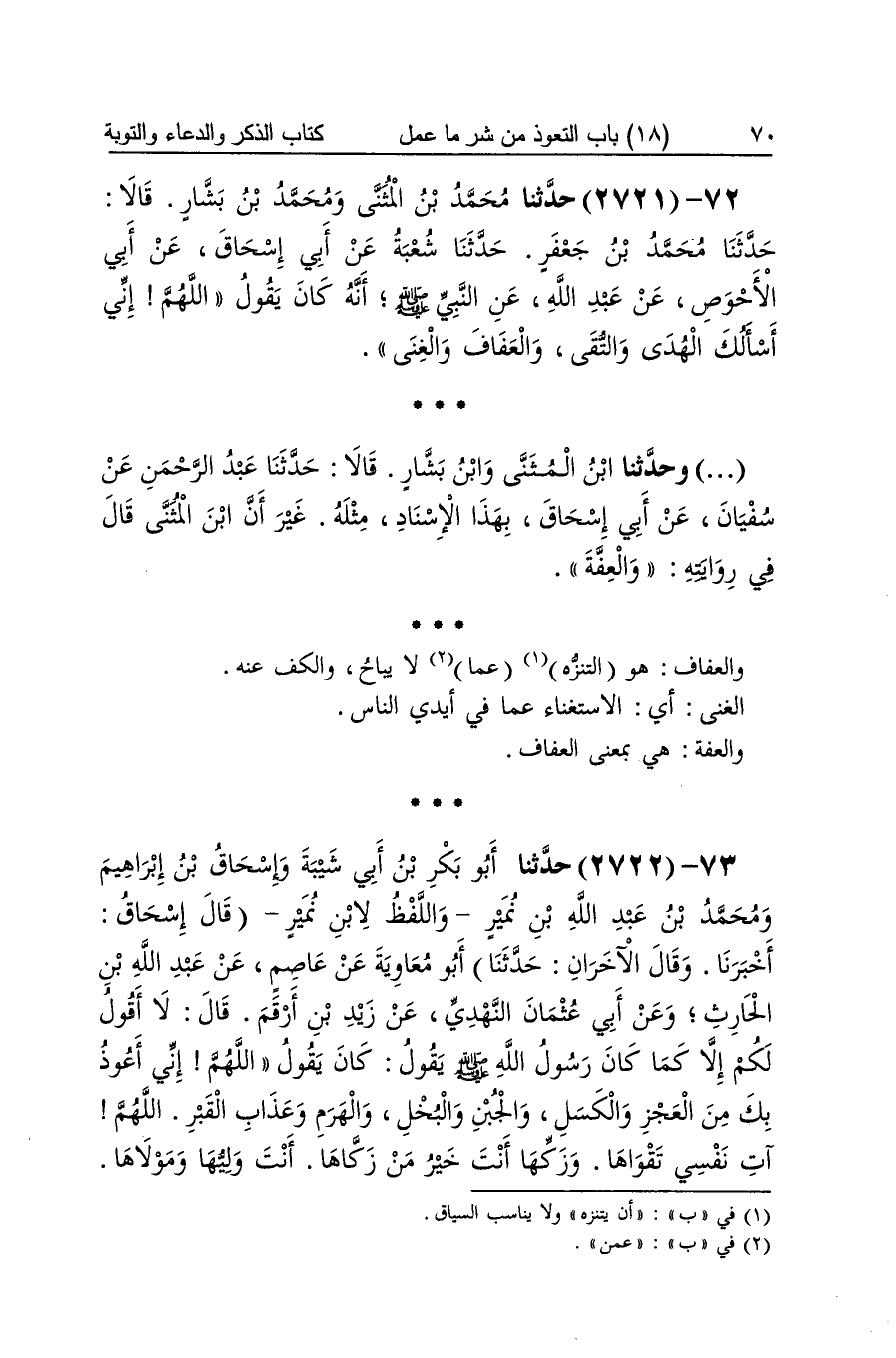 [2721] والعفاف هُوَ التَّنَزُّه عَمَّا لَا يُبَاح والكف عَنهُ الْغنى أَي الِاسْتِغْنَاء عَمَّا فِي أَيدي النَّاس والعفة هِيَ بِمَعْنى العفاف